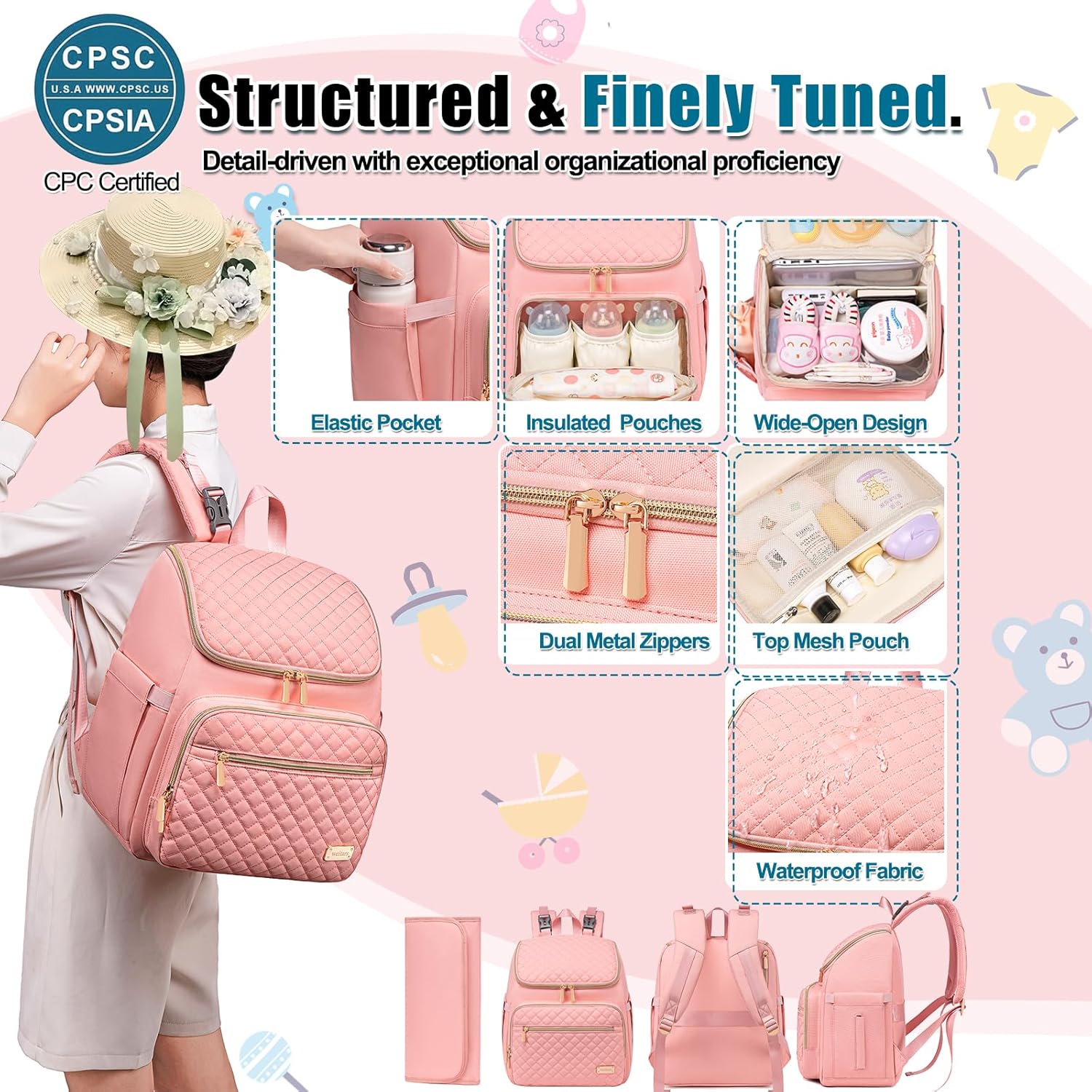 Weitars Diaper Bag Backpack Large Baby Diaper Bag with Changing Pad Travel Diaper Backpack,Baby Bag for Boys Girls,Stroller Straps,5 Insulated Pockets (Pink)