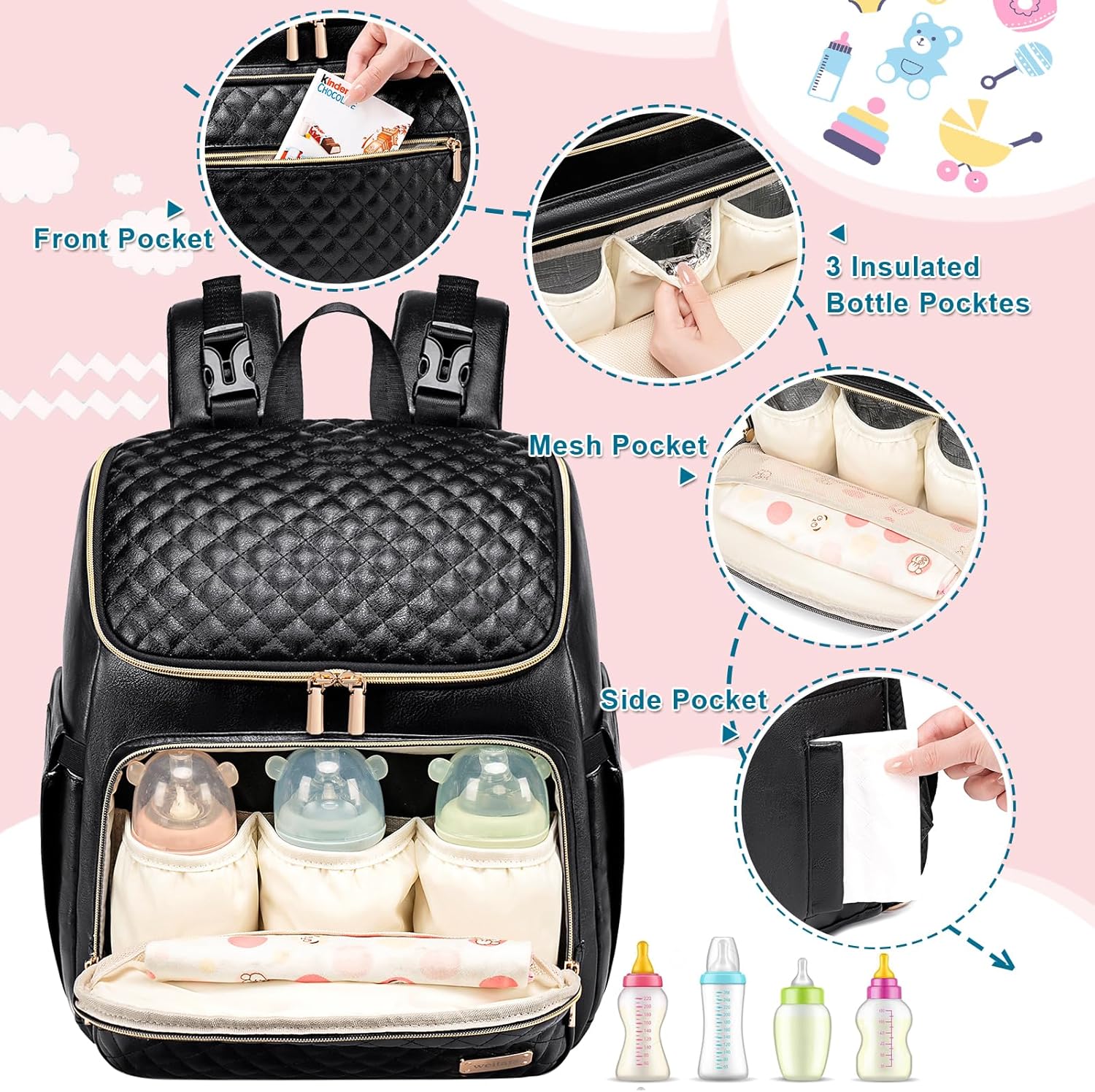 - 【Durable Build & Stylish baby bag】Baby diaper bag/ pañaleras para bebe With a sleek quilted design and gold-tone zippers, toddler diaper bag blends fashion and function. The high-quality faux leather diaper bag exterior resists wear, while the waterproof nylon interior protects contents. Available in multiple colors, it’s a diaper bag essentials for moms who want practicality without sacrificing style.