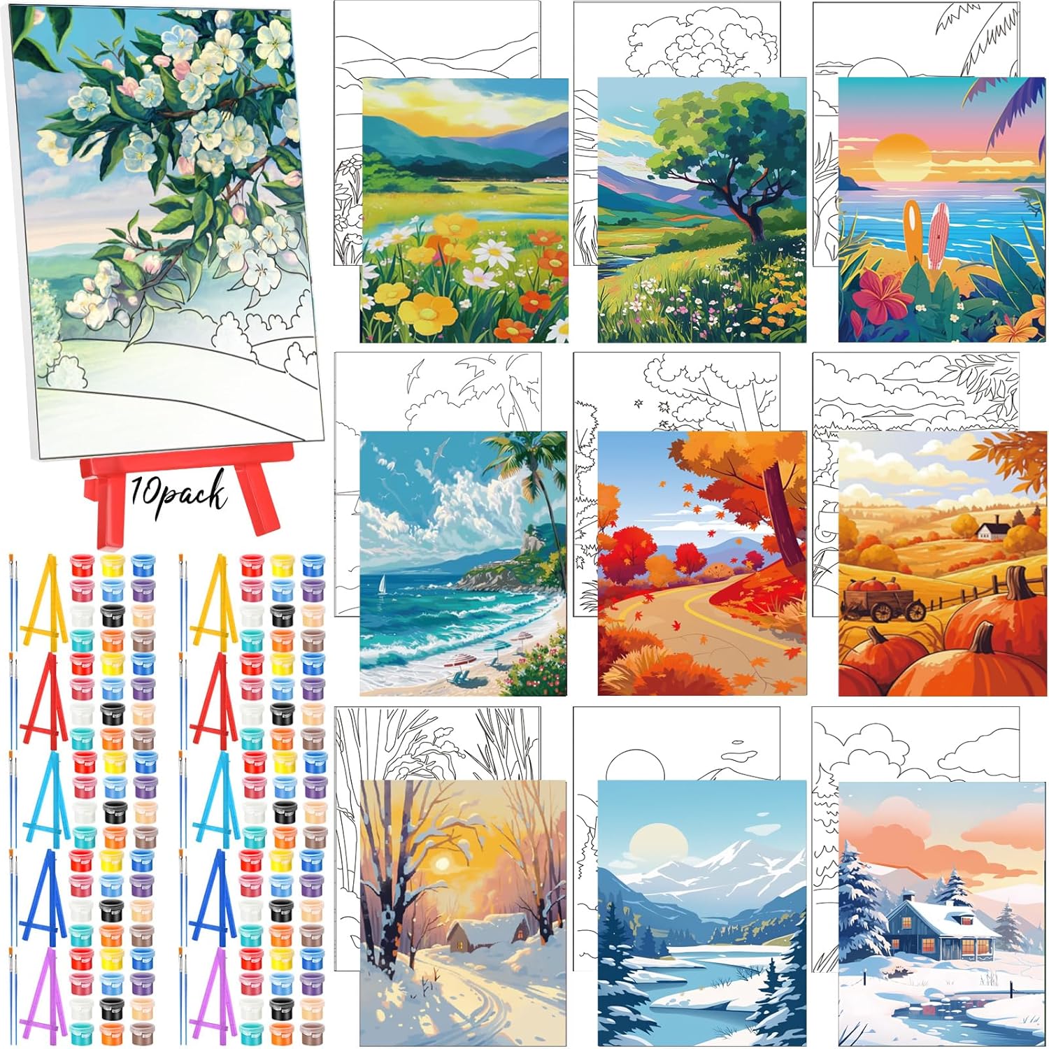 Blosssound 10 Set Pre Printed Canvas Pre Drawn Canvas Painting with Easel Kits 5" x 7" Outline Painting Panels for Beginners, DIY Craft Project, Party Favor, Home Decors(Four Seasons)