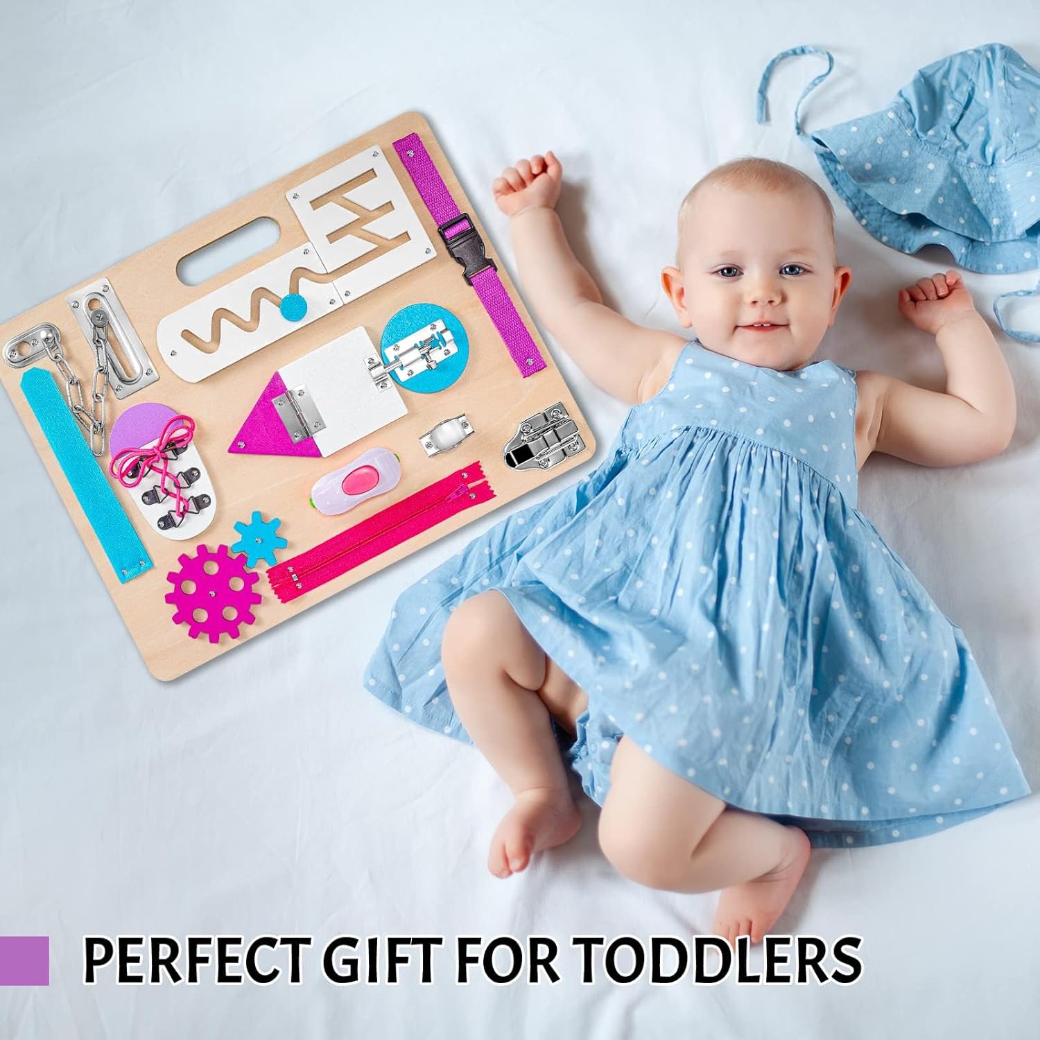 Montessori Busy Board for Toddlers, Wooden Sensory Toys, Kids 1-3 Travel Toy, Preschool Learning Activities for Fine Motor Skills, Basic Life Skills Educational Gifts for 1 2 3 Years Old Girls (Pink)