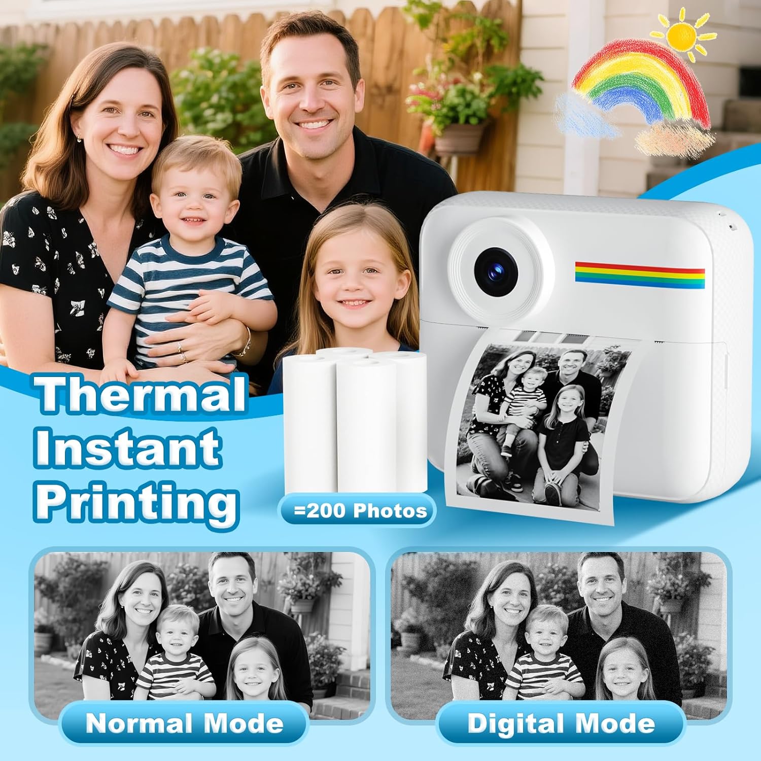 - 【Instant Print】 This kids camera uses safe thermal printing technology to get black-and-white paper photos in 1 second. Comes with 4 rolls of photo paper and also stores color images to a 32G memory card. With 6 scene filters and 28 photo frames, our instant camera allows kids to take fun photos and doodle photos to inspire their desire and interest in photography.