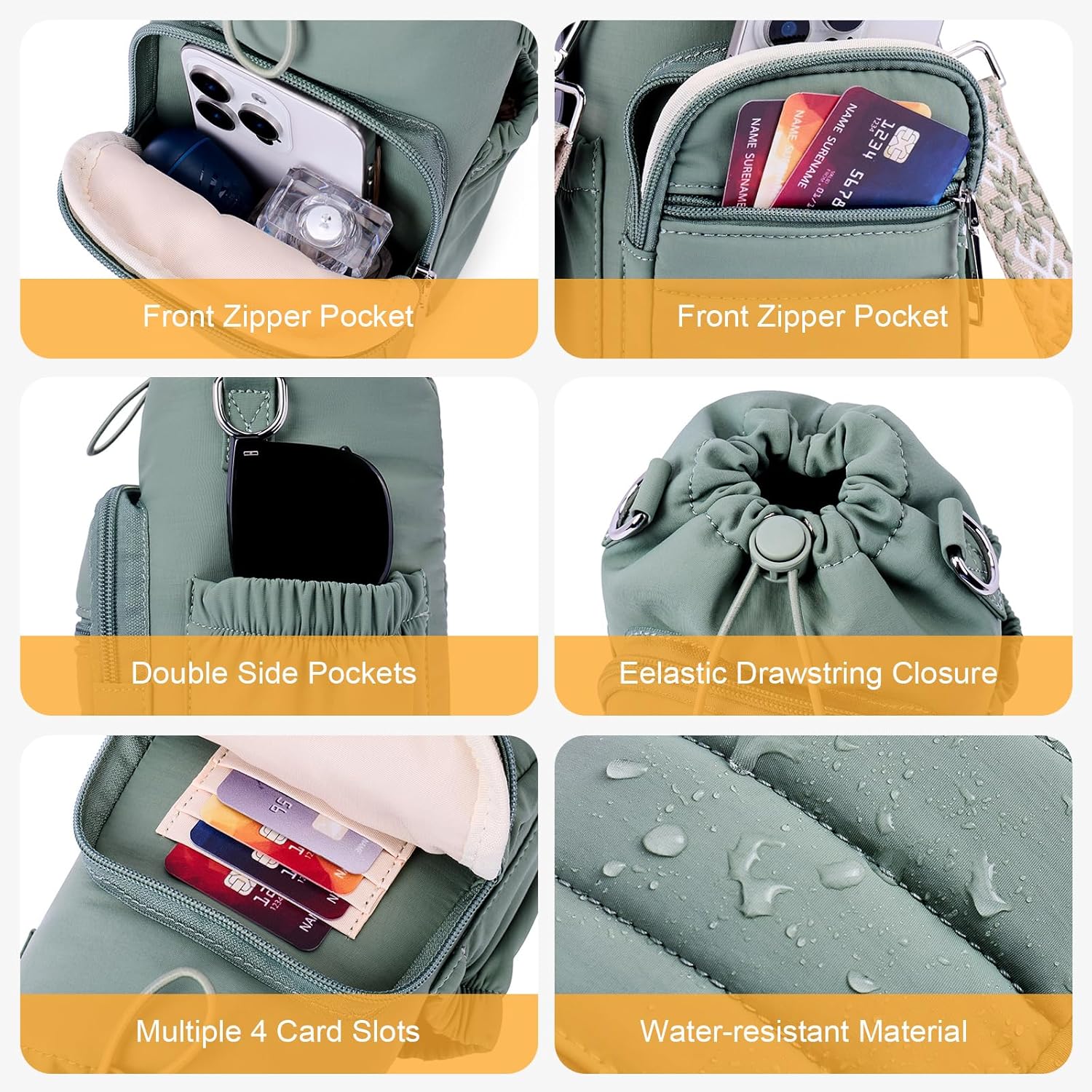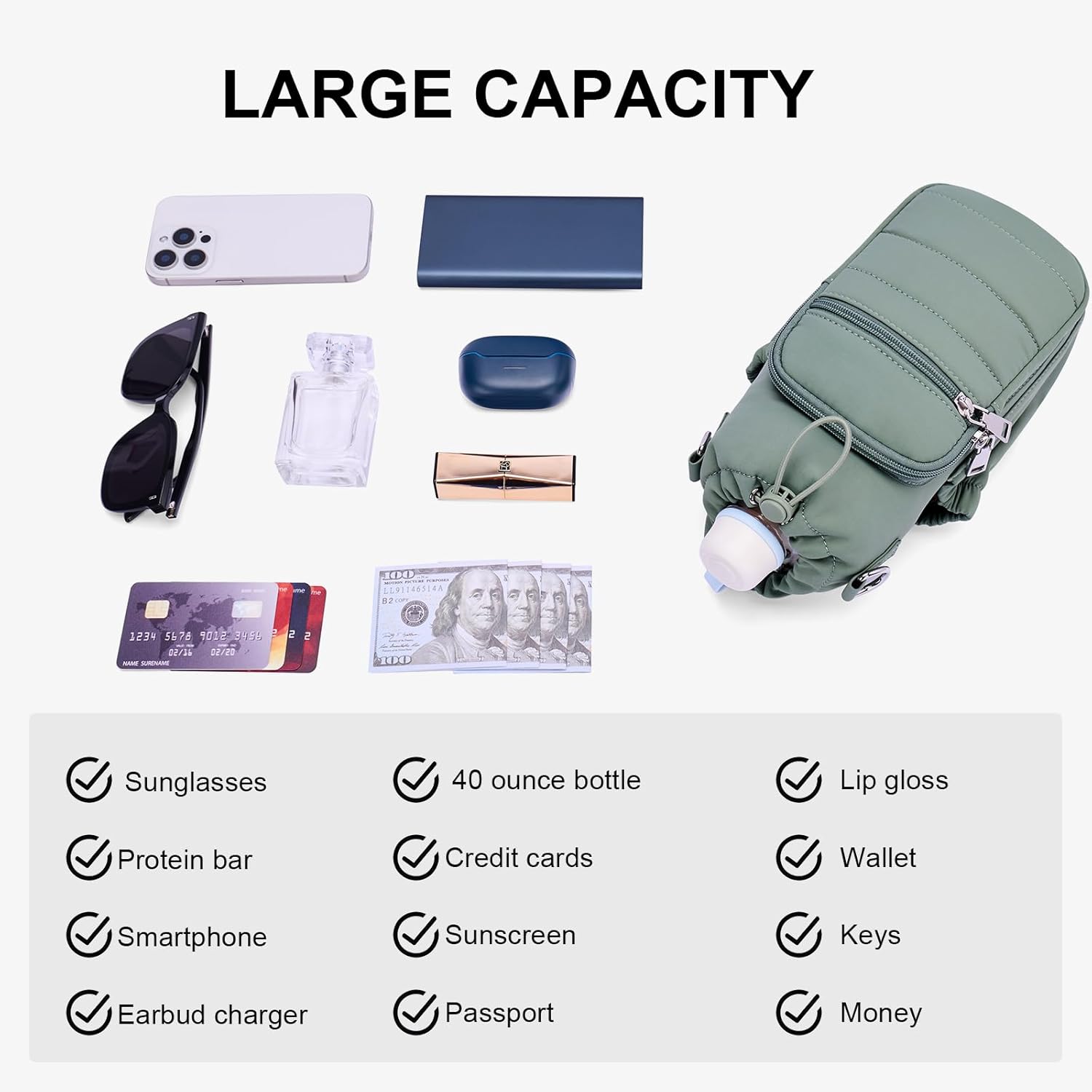 • 【 Functional Storage for Daily Essentials】 More than just a bottle holder—water bottle crossbody bag includes a zippered front pocket that fits large phones like the iPhone Pro Max, plus 4 built-in RFID card slots. Two side pockets easily store sunglasses, sanitizer, or other small essentials, making it perfect for everyday use.