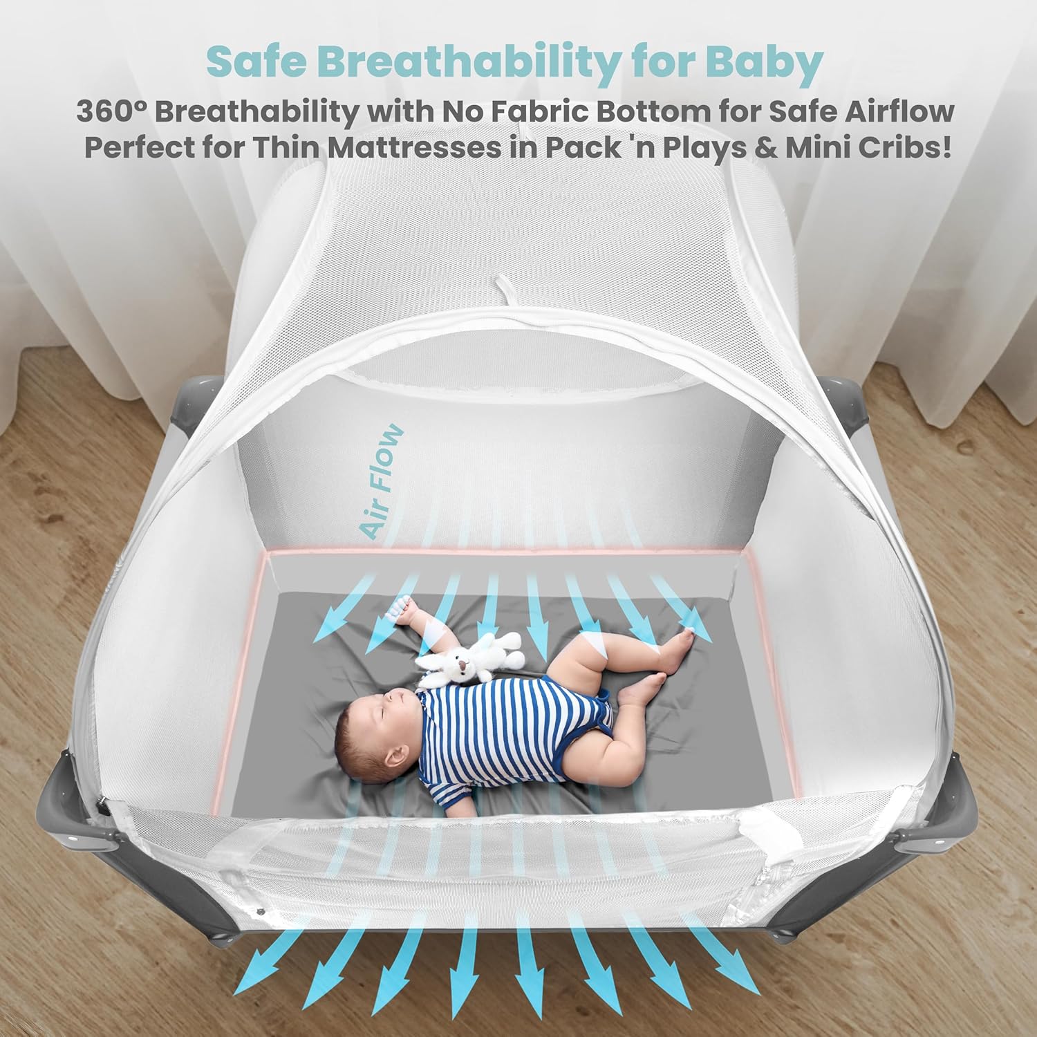 - Universal Fit for Travel & Home: Pop-up design fits most mini cribs and Pack 'n Plays (26 x 38 inches base, 50 inches high); folds flat for storage and includes a carry bag for easy portability