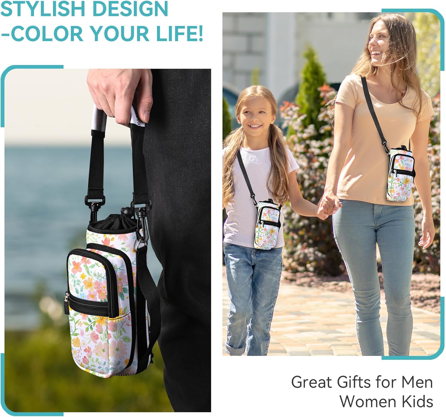 - GREAT FOR TEENS & ADULTS: Both adults and Kids can find great use in this AUPET water bottle carrier holder. Use it for walking,running,gym,cycling,hiking and more.with two zipper pockets for smartphone,cash,card keys and other small items.with the adjustable shoulder strap and the carring strap,it will fits all body types,you can wear over the shoulder, cross chest as a sling bag or just hand carring.<br/>