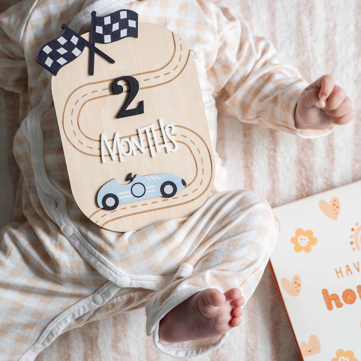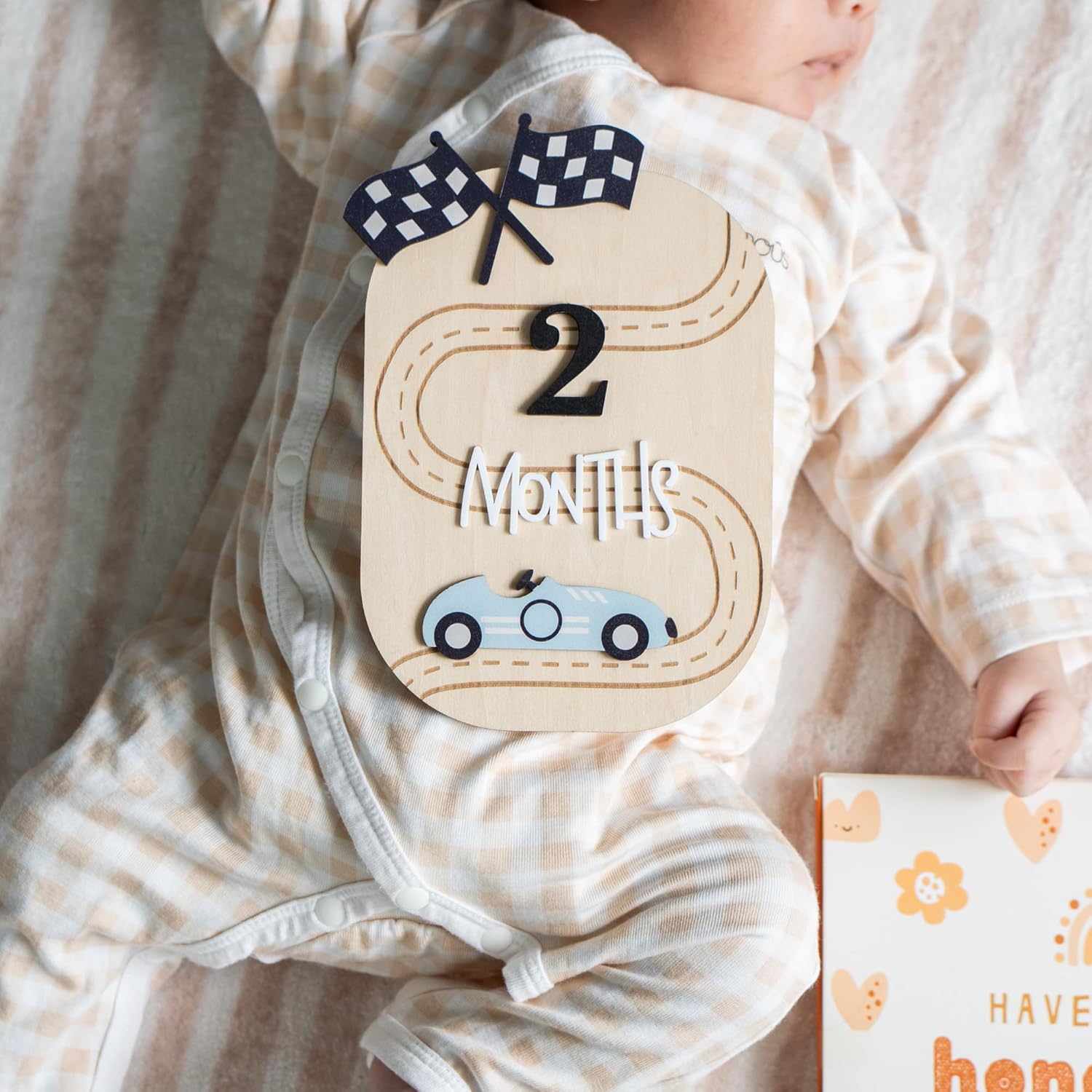 - π Designed for Baby Boys β With checkered flags and a vintage car design, these month milestone baby boy signs are tailor-made to document your little racerβs first year in style.