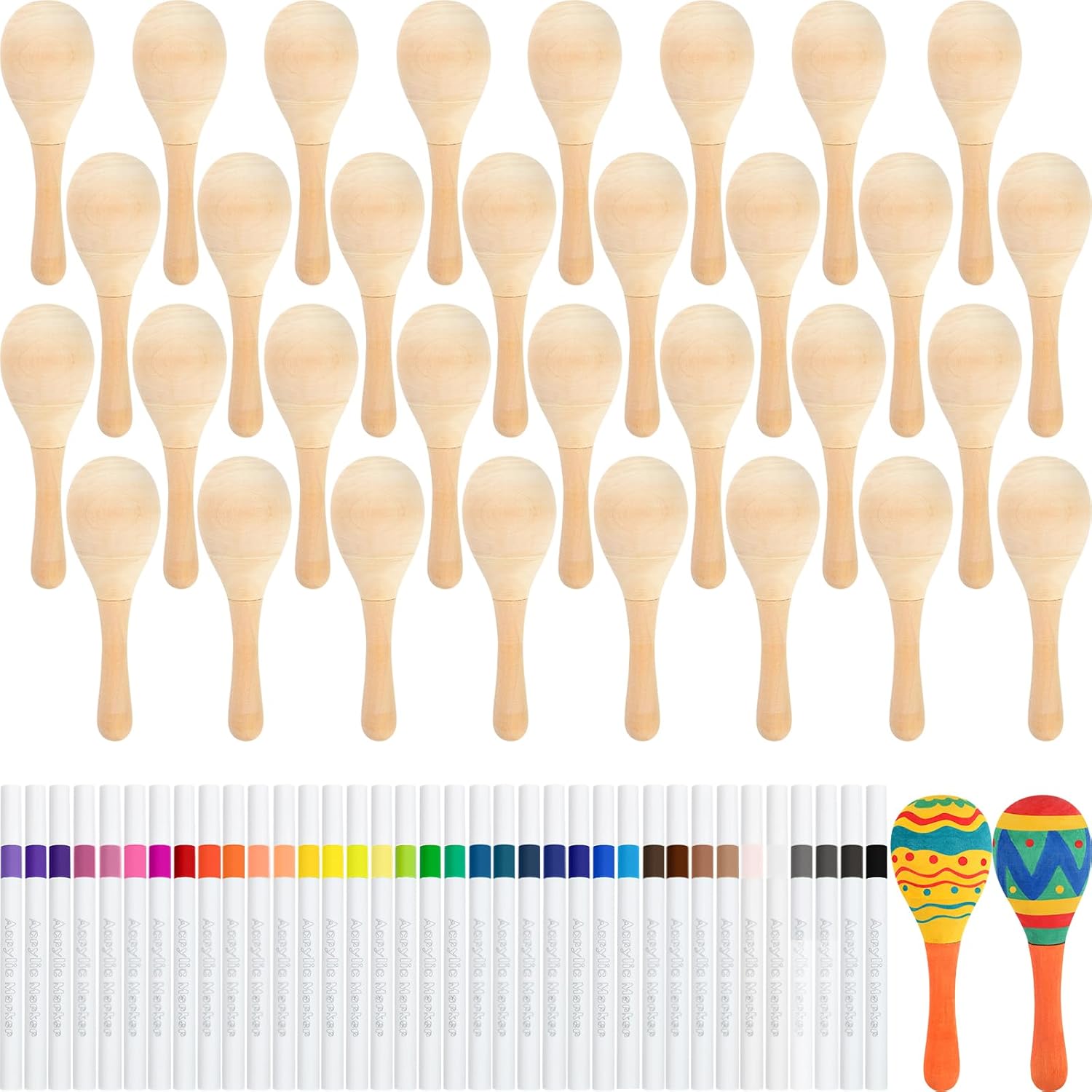 NEBURORA 6Pcs DIY Mini Unfinished Wooden Maracas with 6Pcs Multicolor Pens Fiesta Mexican Maracas Favors Cinco De Mayo Party Supplies Decorations