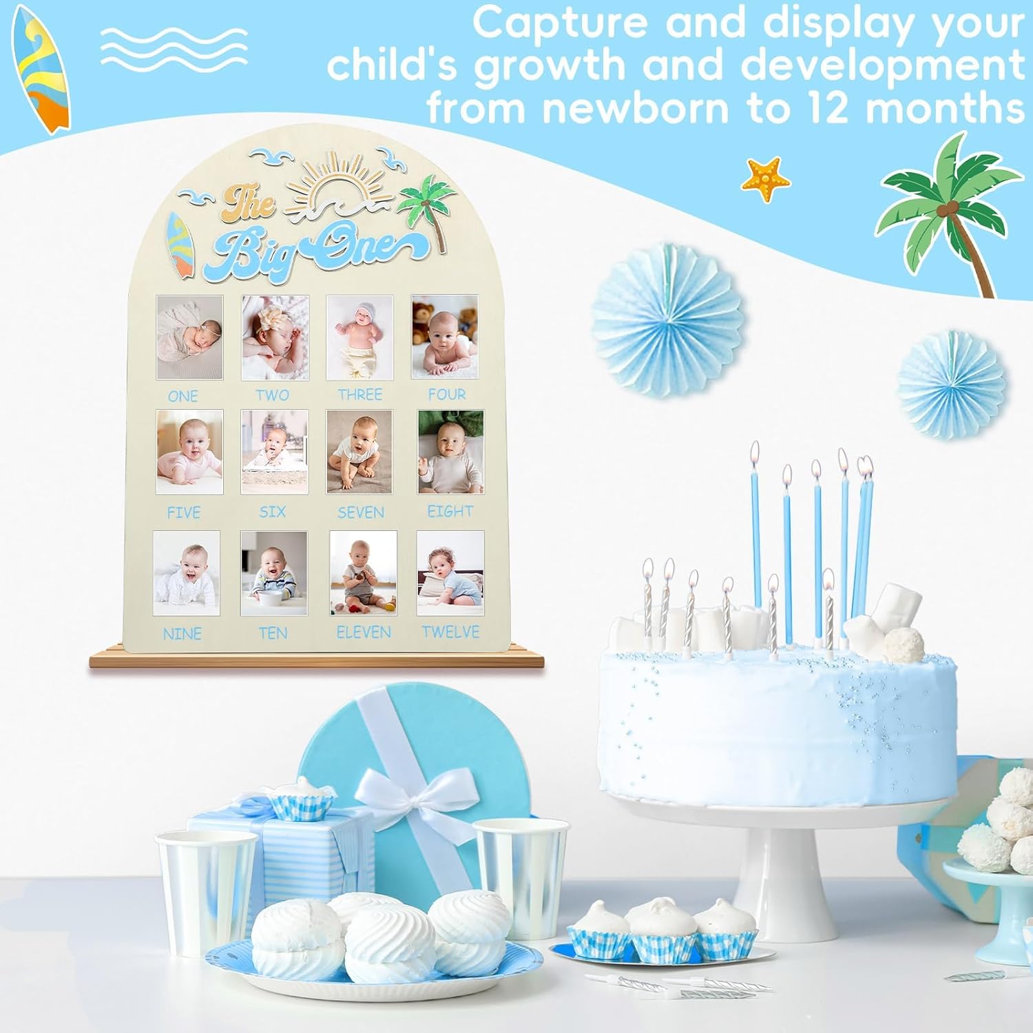- Package includes: You’ll get 1pcs of the big one photo board measuring 16.9 x 12 x 0.2inches, and 2 sheets of adhesive dots for easy installation. Our surf theme birthday wooden board is the ideal keepsake to capture your baby's first year. This 12 monthly milestone picture frame is ideal for displaying cherished photos from each month, creating a beautiful memory of your child's growth and milestones.