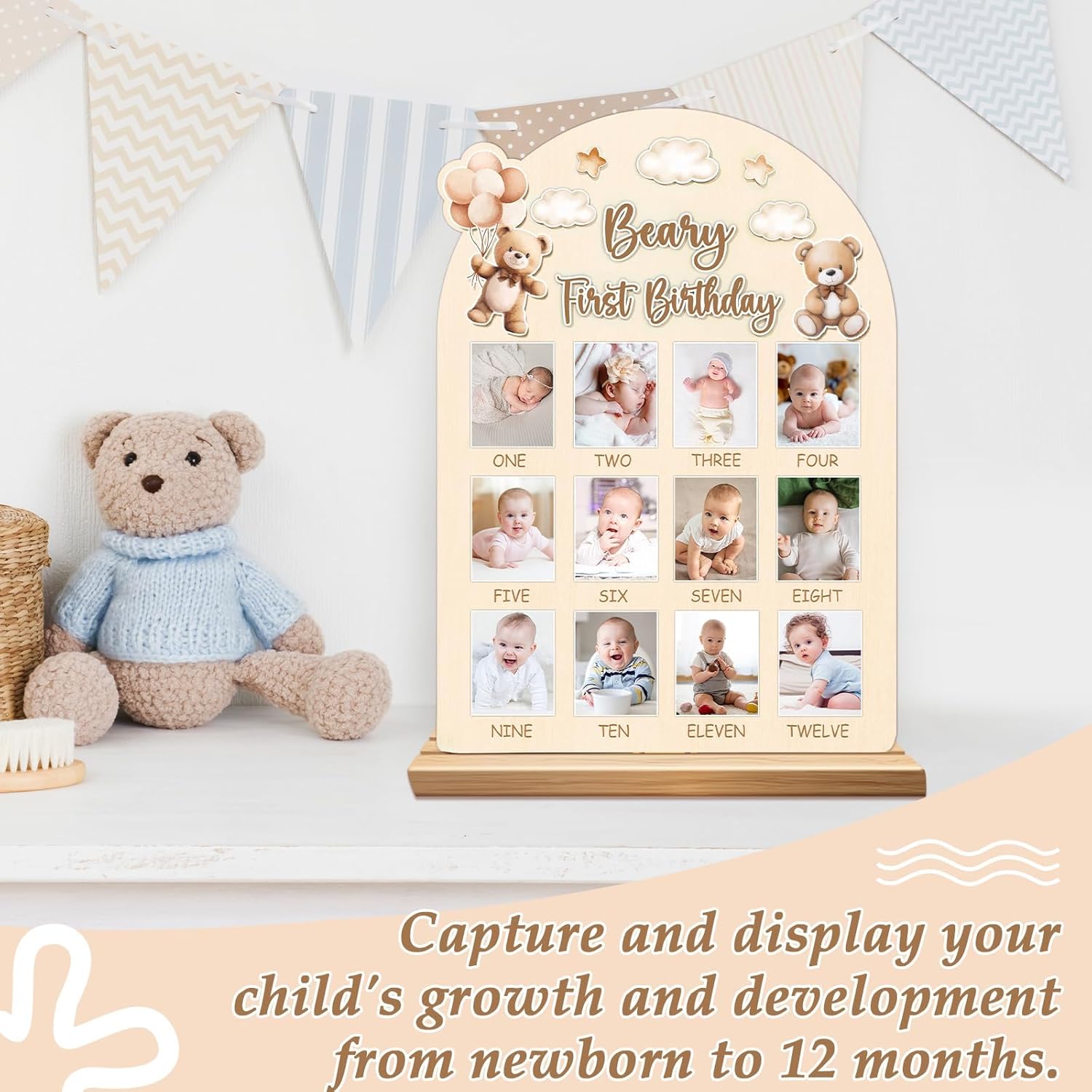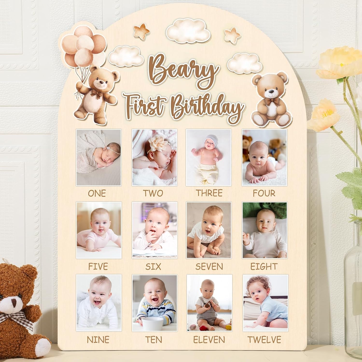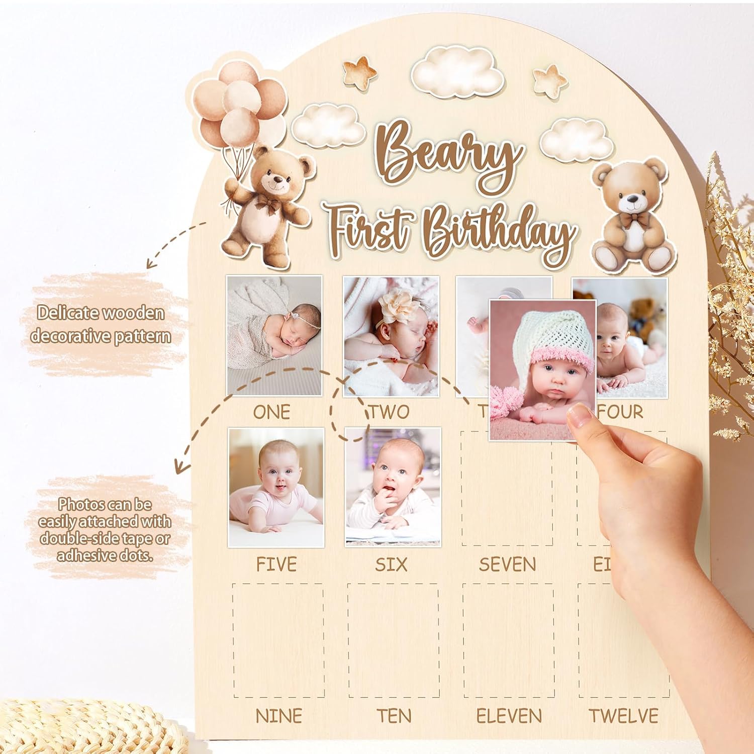 - Package includes: You’ll get 1pcs of beary first birthday photo board measuring 16.9 x 12 x 0.2inches, and 2 sheets of adhesive dots for easy installation. Our bear theme birthday wooden board is the ideal keepsake to capture your baby's first year. This 12 monthly milestone picture frame is ideal for displaying cherished photos from each month, creating a beautiful memory of your child's growth and milestones.