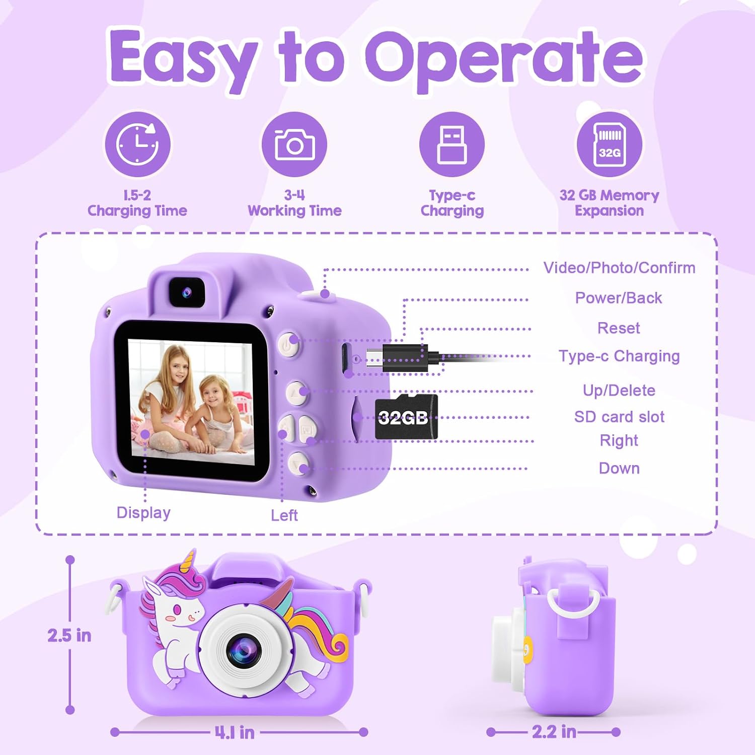 Kids Camera, Toys for Toddlers Age 3-8 Year Old Girl Christmas Birthday Gifts, Children Digital Camera with Cartoon Soft Silicone Cover and 32GB Card (Violet)