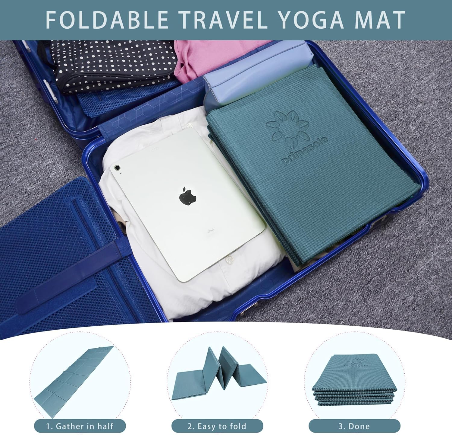 - 【GREAT FOR TRAVEL, PARK, BEACH】 Yoga Mat folds up nicely, Fit in Back-pack, Suitcase, Tote bag. After yoga class or gym, fit in your bag and go to shopping, lunch and class at campus. Ideal size for travel, school, park, and beach.