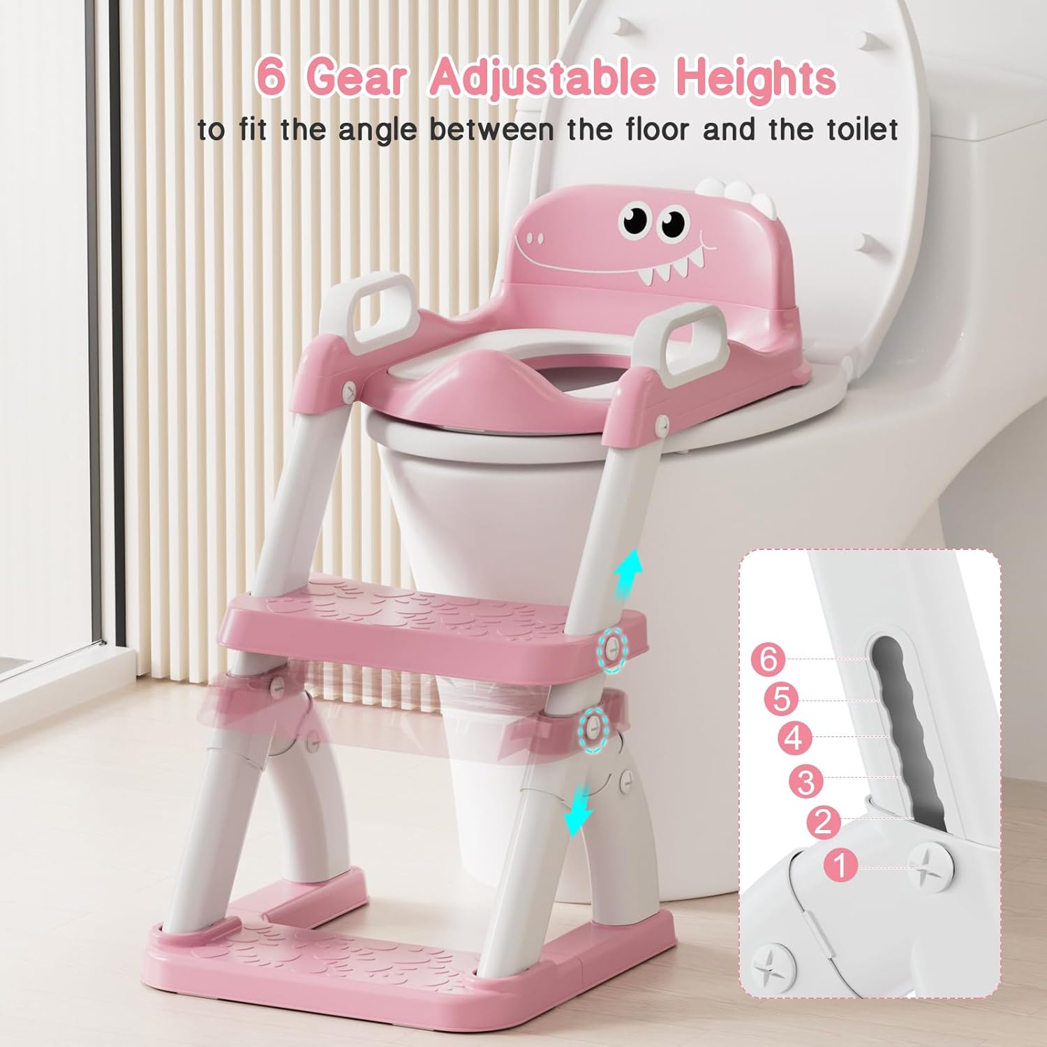 - β [ADJUSTABLE HEIGHT AND FOLABLE ]: Our toddler toilet seat with steps has 6 adjustable heights which ensures that it fits 99.99% shape and highs of all toilets (like V/U/O shape. NOT for square), the foldable design allows it maximize the space-saving when not in use and keep everything in order.