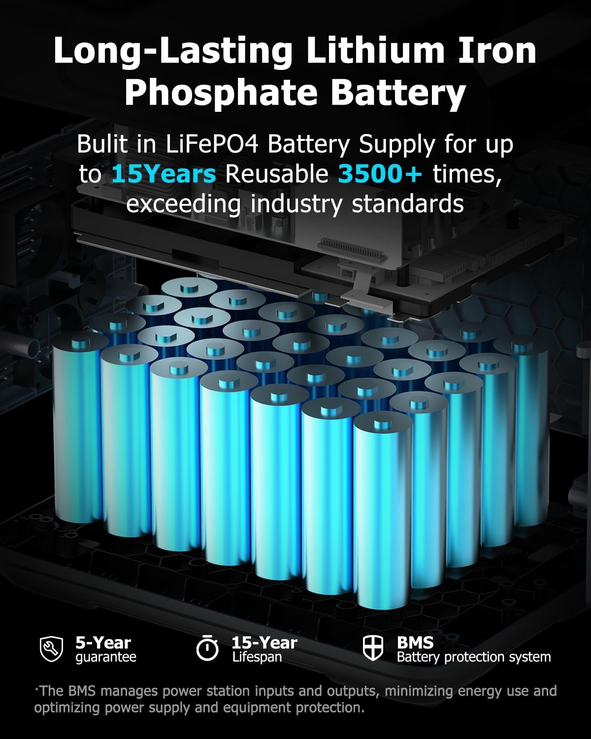 - [Uses high-quality LiFePO4 battery] The built-in battery uses a lithium iron phosphate battery (LiFePO4) that lasts 15 years with over 3500 charge/discharge cycles. It lasts seven times longer than conventional batteries and costs less. It also has a battery management system (BMS) and control unit (MCU) to manage battery cell voltage and temperature.