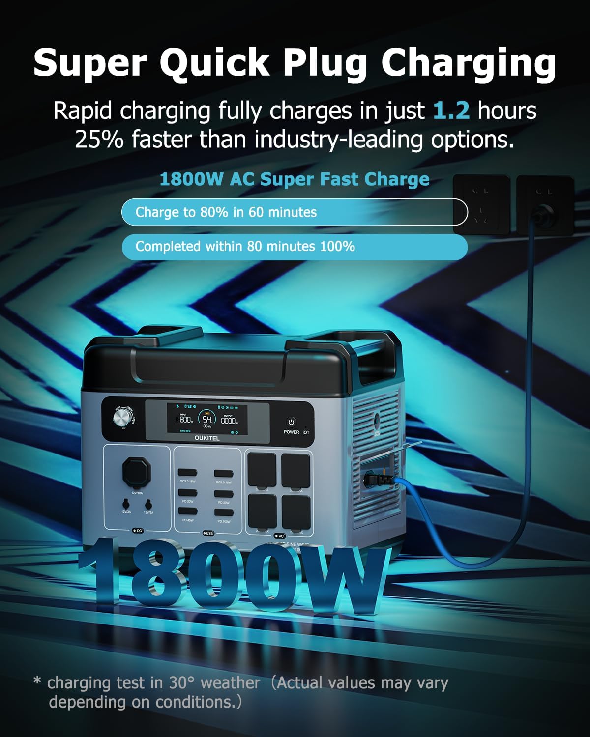 - [Recharge in a Rush] With 1800W AC charging, achieve 80% battery capacity in just 1 hour and a full charge in 1.5 hours. Combine solar and AC input up to 2300W to achieve 80% battery capacity in just 50 minutes and a full charge in 80 minutes.