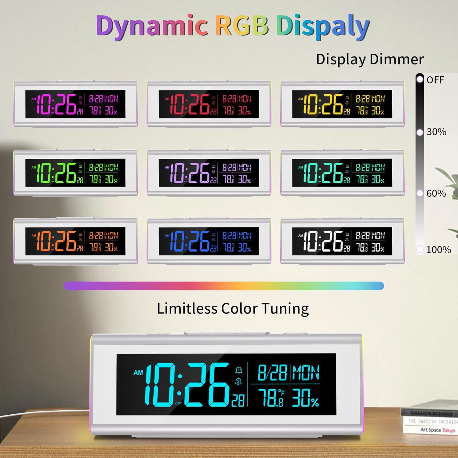 Digital Alarm Clocks for Bedrooms, LED Desk Clock with RGB Night Light, Brightness Dimmer, Date, Week, Temperature Large Display, Modern Decor for Desk, Office, Gift for Kids, Teen, Adults (Silver)