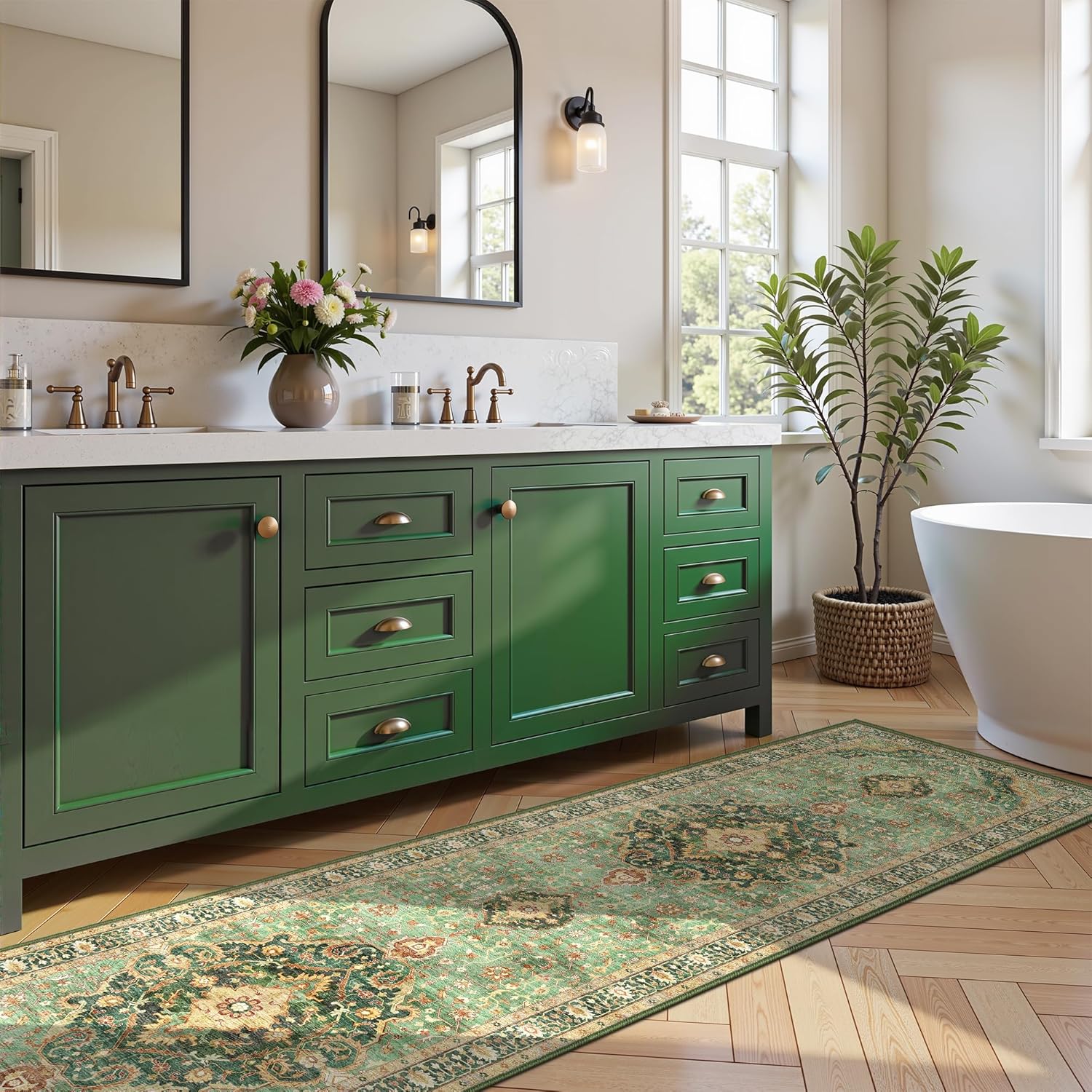 Green Boho Washable 3x12 Extra Long Runner Rug for Hallway, Waterproof Large Kitchen Floor Rug, Non-Slip Stain & Fade Resistant, Vintage Floral Decor
