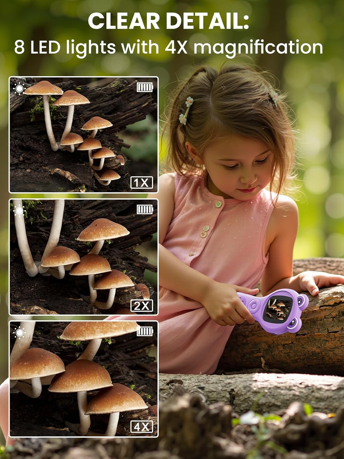 - 200W High Definition Pixels: 2-inch IPS color screen with 500x magnification and 4x zoom, high definition allows kids to take a closer look at the veins of plants, the shape of stamens, the wings of insects, the composition of stamps, and start an exciting journey of microscopic exploration