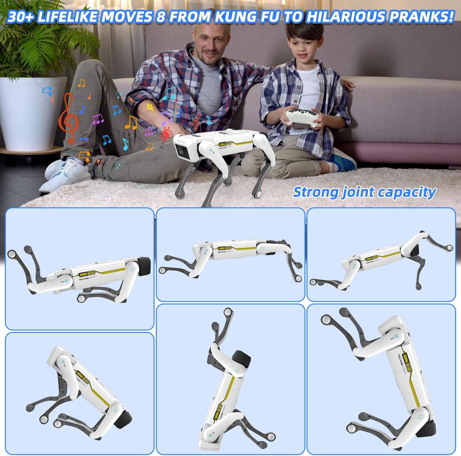 - Interactive Smart Robot Dog - Designed with strong joint and advanced mechanics, this smart AI dog can perform complex actions like kungfu, patrol, act cute, surrender,hand-stand, get down and so on. Besides, it can dance, play music and tell story, a wonderful interactive robot toys