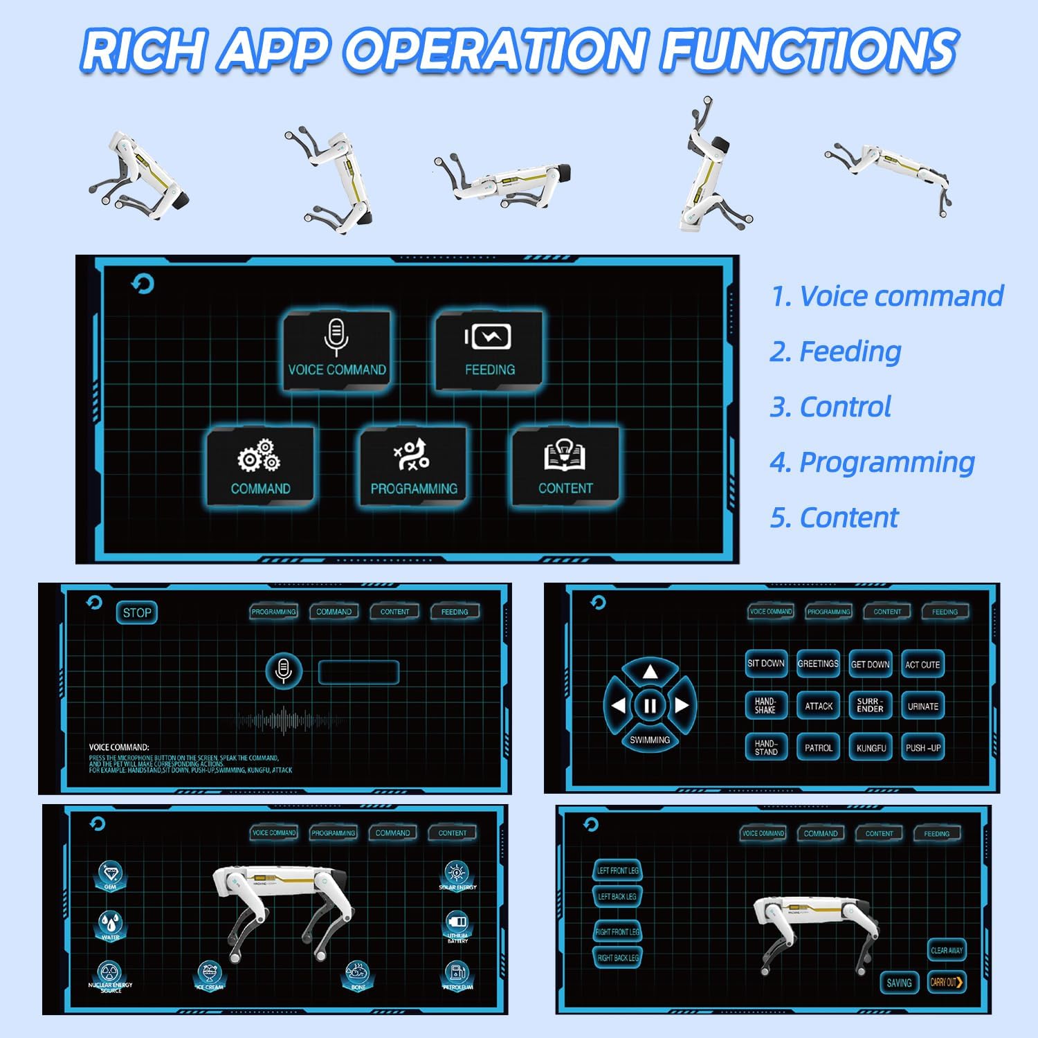- Voice Commands, APP & Remote Control - You can control this robot puppy via simple English voice commands, physical remote or smart dedicated app. What’s more, The smart robot dog supports programming, you can customize its actions as you like, which can help to spark kids’ interest in STEM