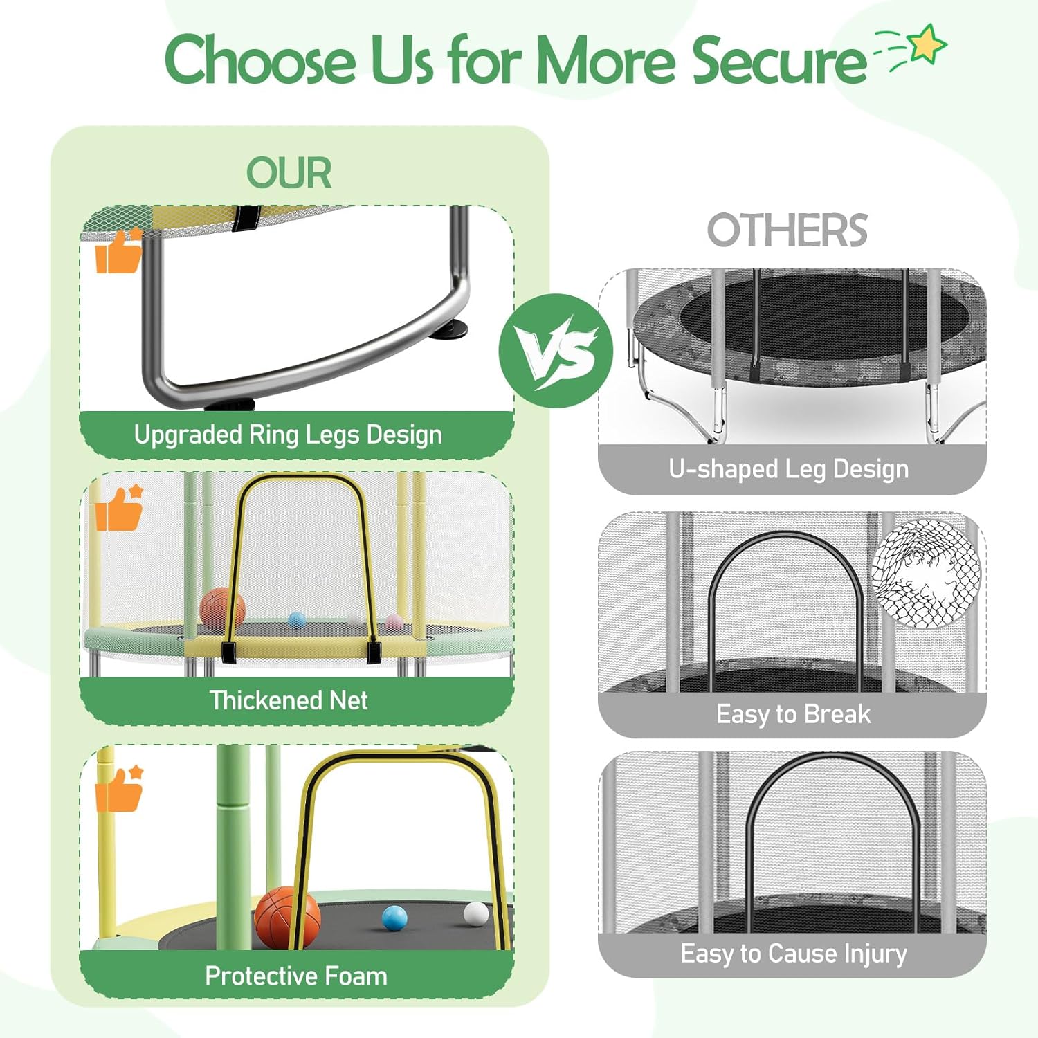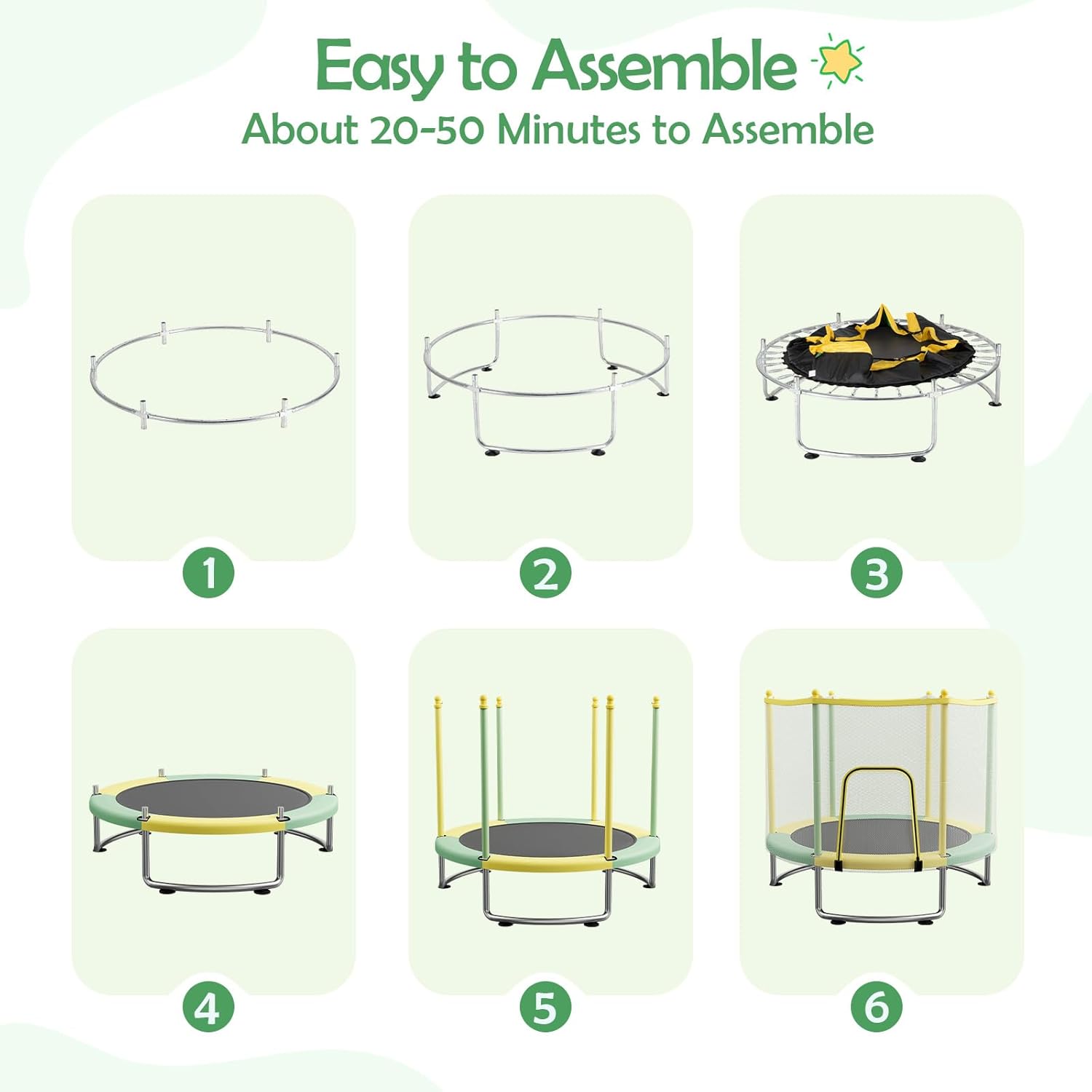 - 【Quick & Tool-Free Assembly】Set up your toddler trampoline in just 6 simple steps—no extra tools required! Clear instructions make assembly quick and stress-free, so your kids can start jumping in minutes. Missing parts? Contact us and we’ll resolve it within 24 hours.