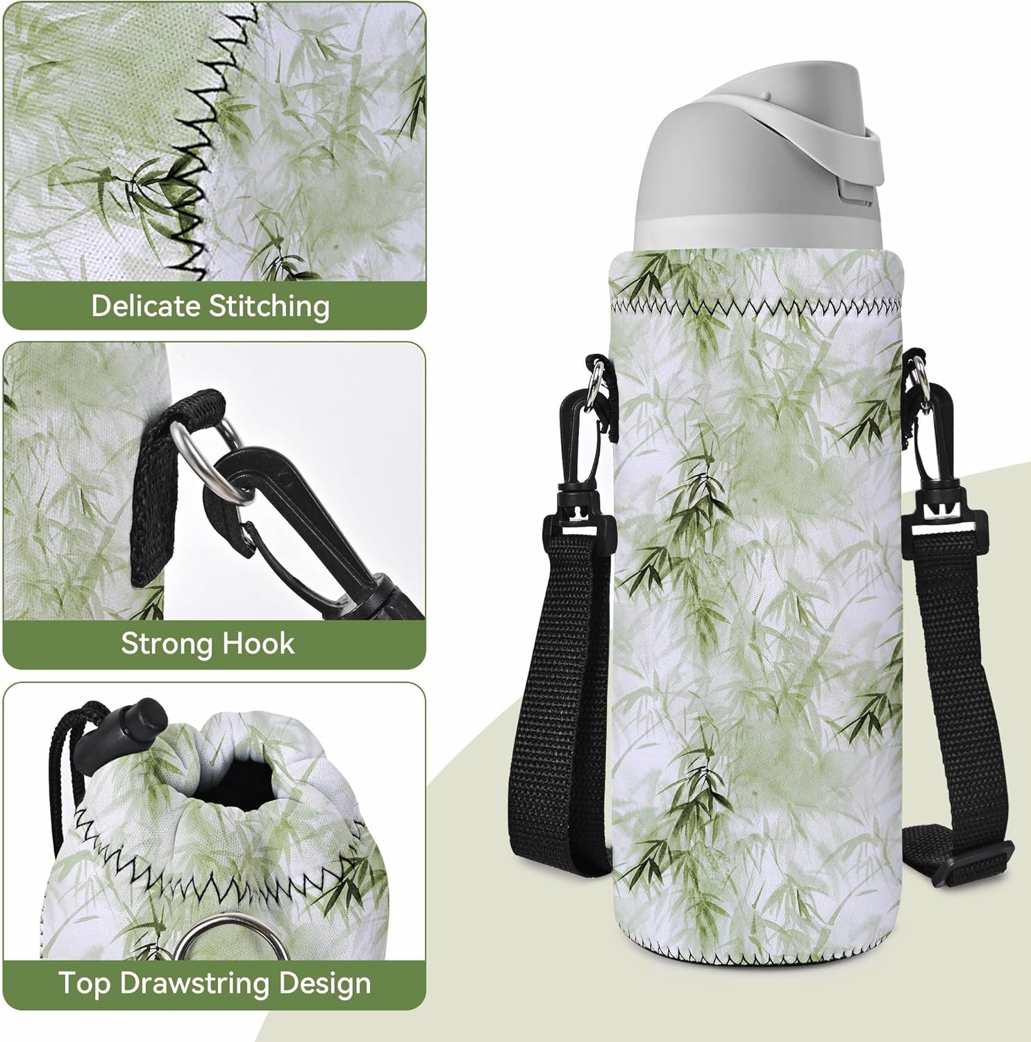 - Three Size for your choice: 500ML(16.9oz) water bottle bag,Length-7.48 inches,Diameter-2.75 inches;750ML(24oz) water bottle holder,Length-8.26 inches,Diameter-3.14 inches;1000ML(34oz) water bottle carrier,Length-9.45 inches,Diameter-3.34 inches.
