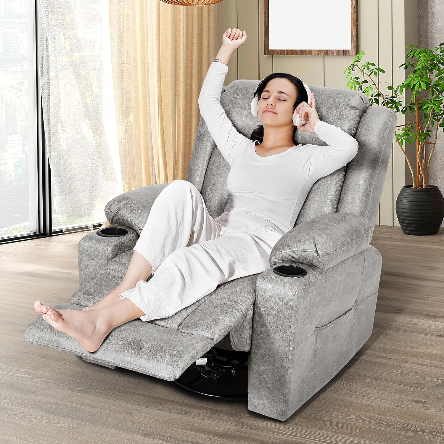 - Swivel Rocker Recliner Chairs:Swivel recliner chairs for adults have 360° Swivel, 30° Rocking, and 90-150° angle reclining function for versatile use. Easily adjust the small rocker recliner chair by pulling out the lever located next to the armrest to activate the footrest. Note that the swivel recliner chair backrest smoothly retracts as you change positions.The swivel function adds an element of fun and entertainment and it fits into tight spaces for a comfortable experience.
