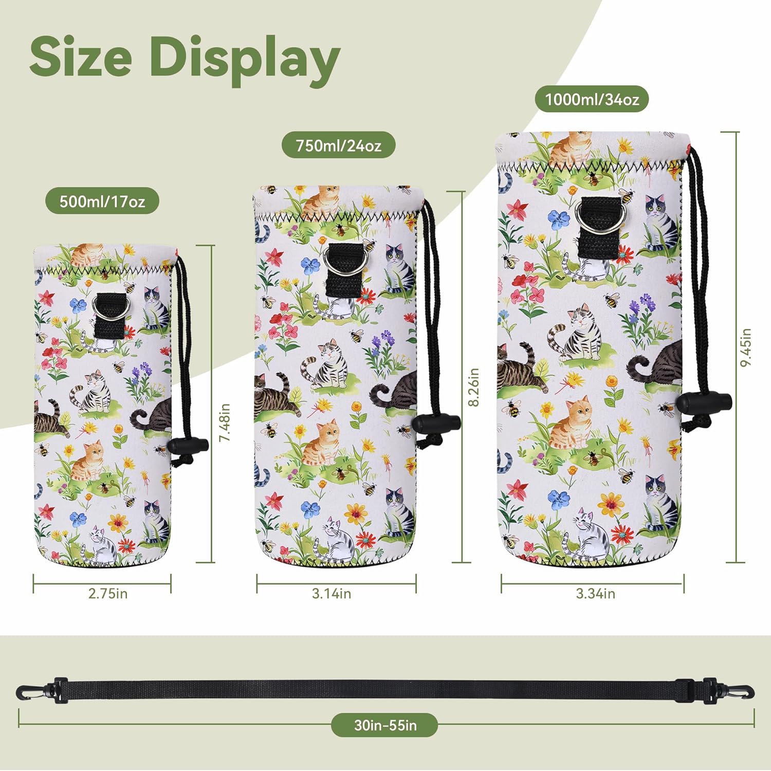 - Three Size for your choice: 500ML(16.9oz) water bottle bag,Length-7.48 inches,Diameter-2.75 inches;750ML(24oz) water bottle holder,Length-8.26 inches,Diameter-3.14 inches;1000ML(34oz) water bottle carrier,Length-9.45 inches,Diameter-3.34 inches.