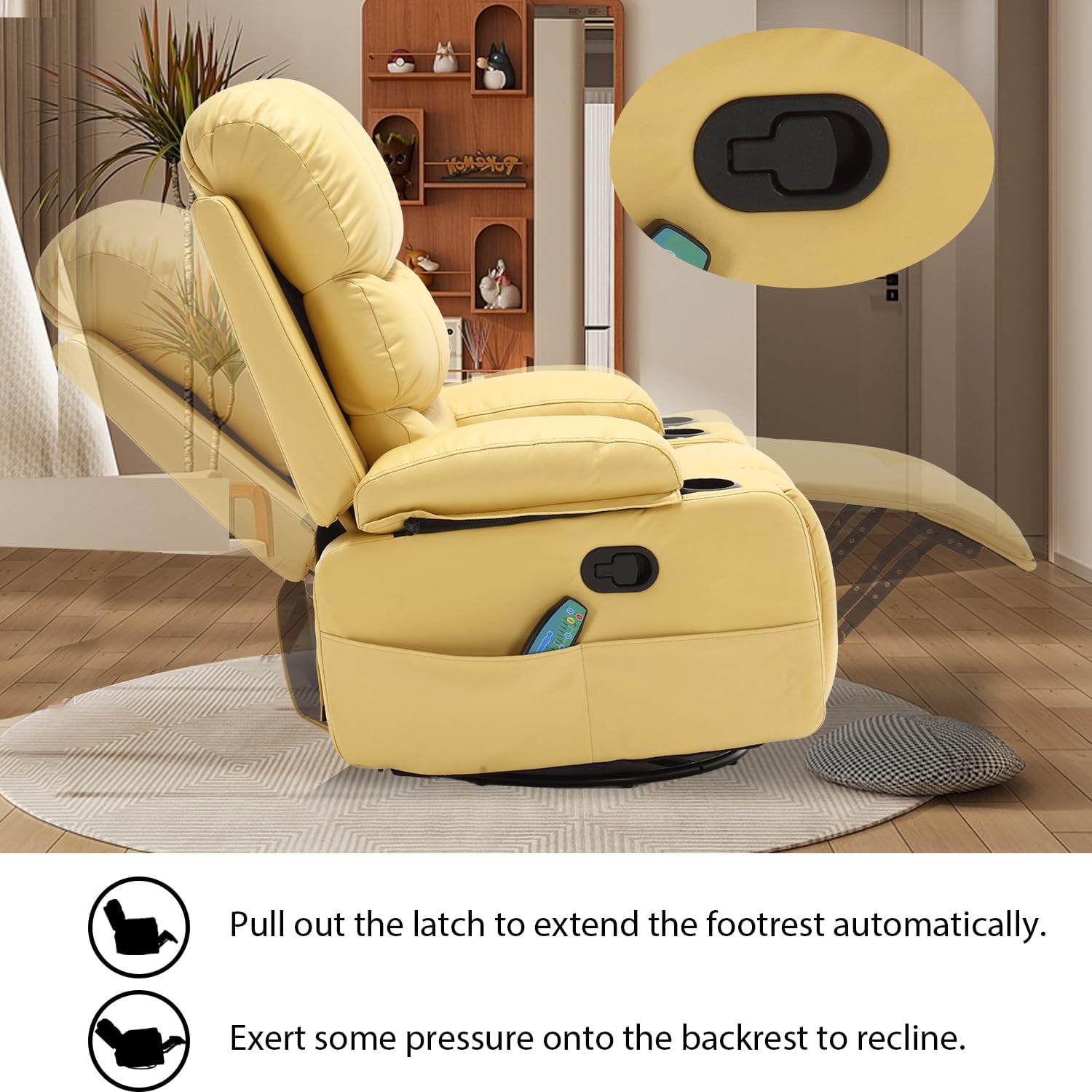 KCQ Massage Swivel Rocker Recliner Chairs with Heat Cup Holders Faux Leather Overstuffed Manual Reclining Chair Rocking Glider Chair for Adults, Yellow