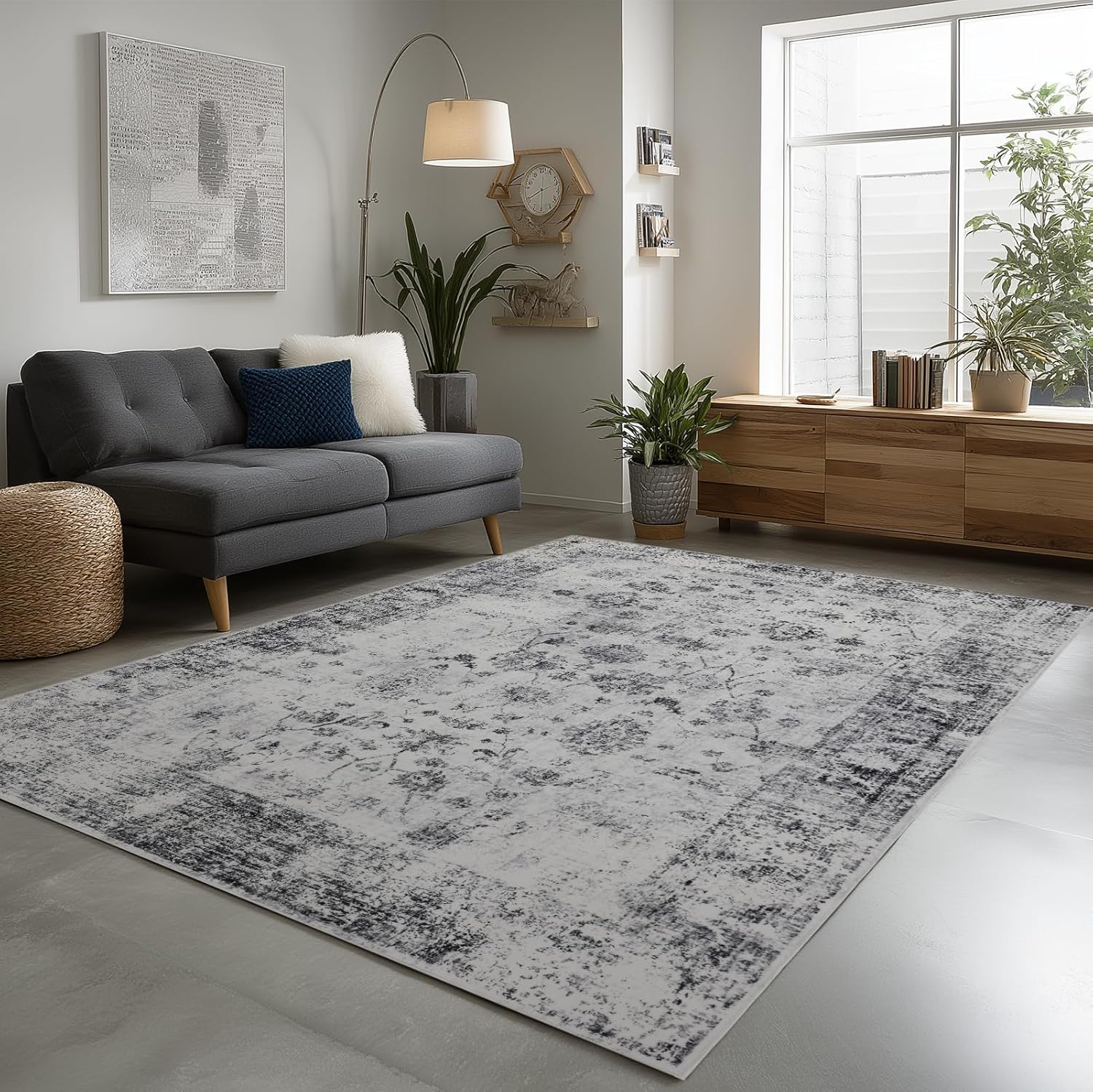 9x12 Area Rug Living Room Rugs, Stain Resistant Washable Rug, Vintage Large Non-Slip Backing, Low Pile Lightweight Print Rug for Bedroom Dinning Room Home Office (White/Grey)