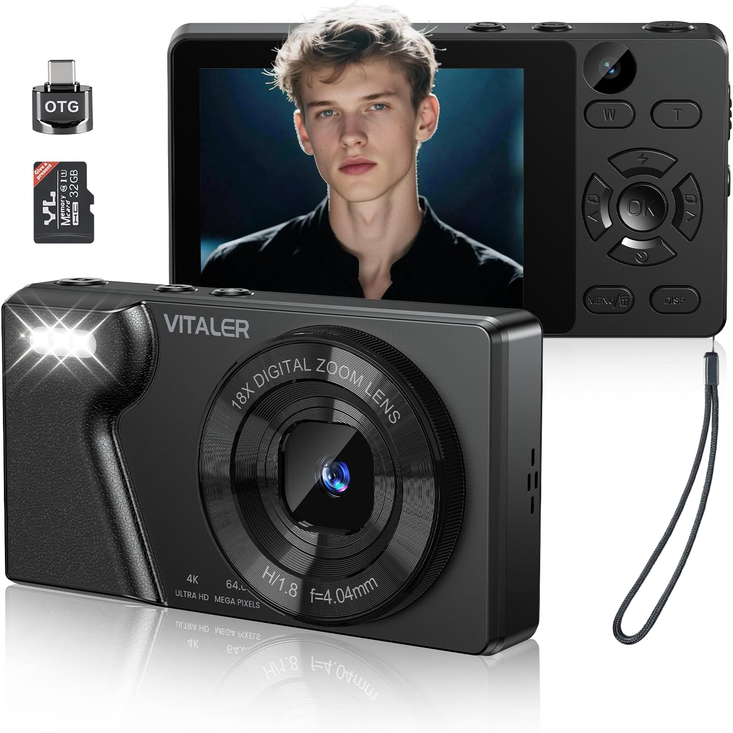 - Innovative Dual-Lens & Perfect Selfies: This compact digital camera features front and rear dual lenses and the latest CMOS sensor system, supporting 64MP high-resolution photos and 4K Ultra HD video recording. Equipped with a front-facing camera that perfectly solves the selfie problem, allowing you to capture and share more happy moments clearly, is ideal for selfie enthusiasts and vlogging creation.