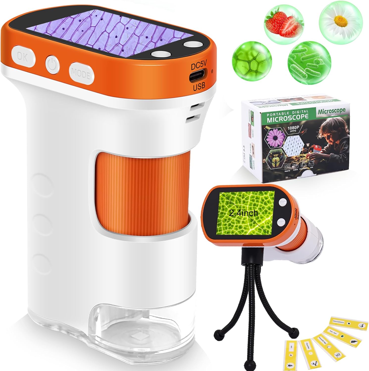 Microscope for Kids 1000x Magnification, 2.4-inch ScreenPocket Microscope with Photo and Video Recording (with Slide Kit) Portable Educational Gift