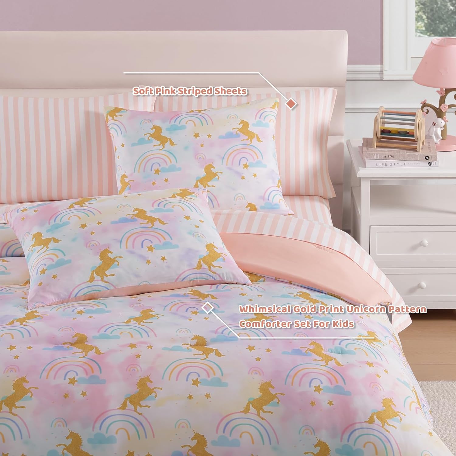 Twin Comforter Set with Sheets for Girls-5 Pieces Twin Bedding Sets with Pink Comforter, Sheets, Pillowcase & Sham for Kids (Gold Unicorn, 66" X 86")