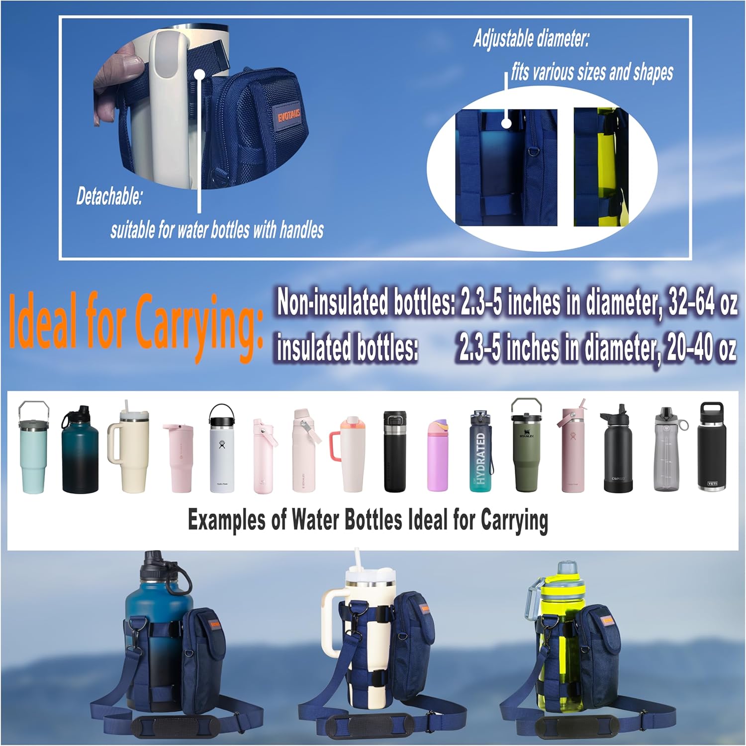 - Adjustable Fit & Wide Compatibility – The water bottle bag adjusts and locks securely to Fits most standard water bottles on the market: works for non-insulated bottles (2.3–5 inches in diameter, 32–64 oz) and insulated bottles (2.3–5 inches in diameter, 20–40 oz).