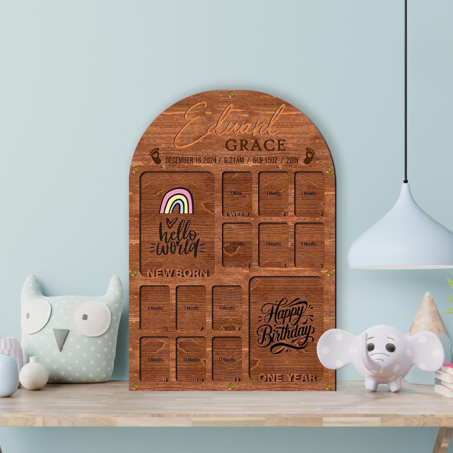 - Our my first year frame features a unique design with hook and point stickers for easy hanging and decoration. Made from high-quality, thick wood, this 12 Month Photo Frame offers lasting durability. Let your baby's photos shine in these baby milestone board, babys first year photo frame, 1-12 months baby milestone picture frame, baby first year frame and my first year picture frame, 12 months photo frame, first year baby frame and my first year picture frame 12 months.