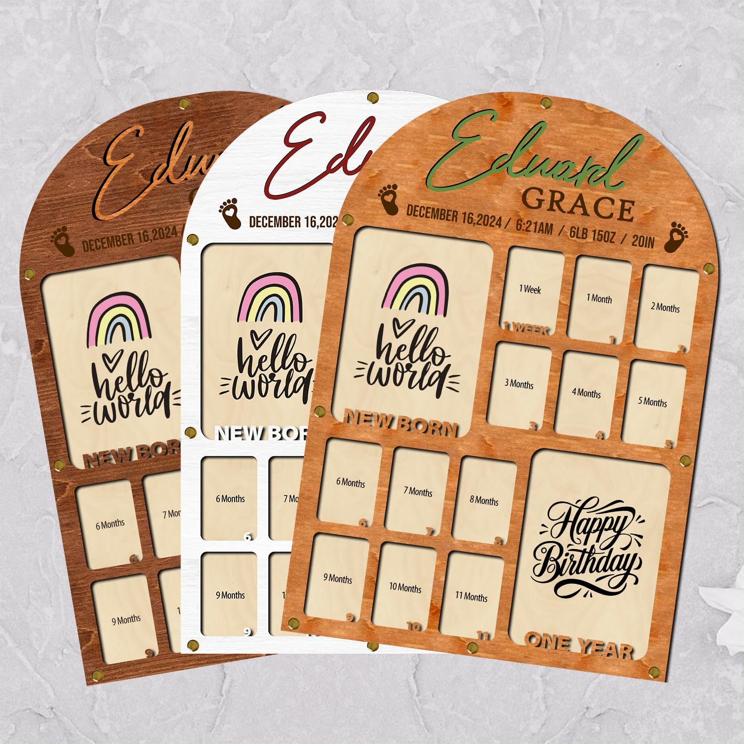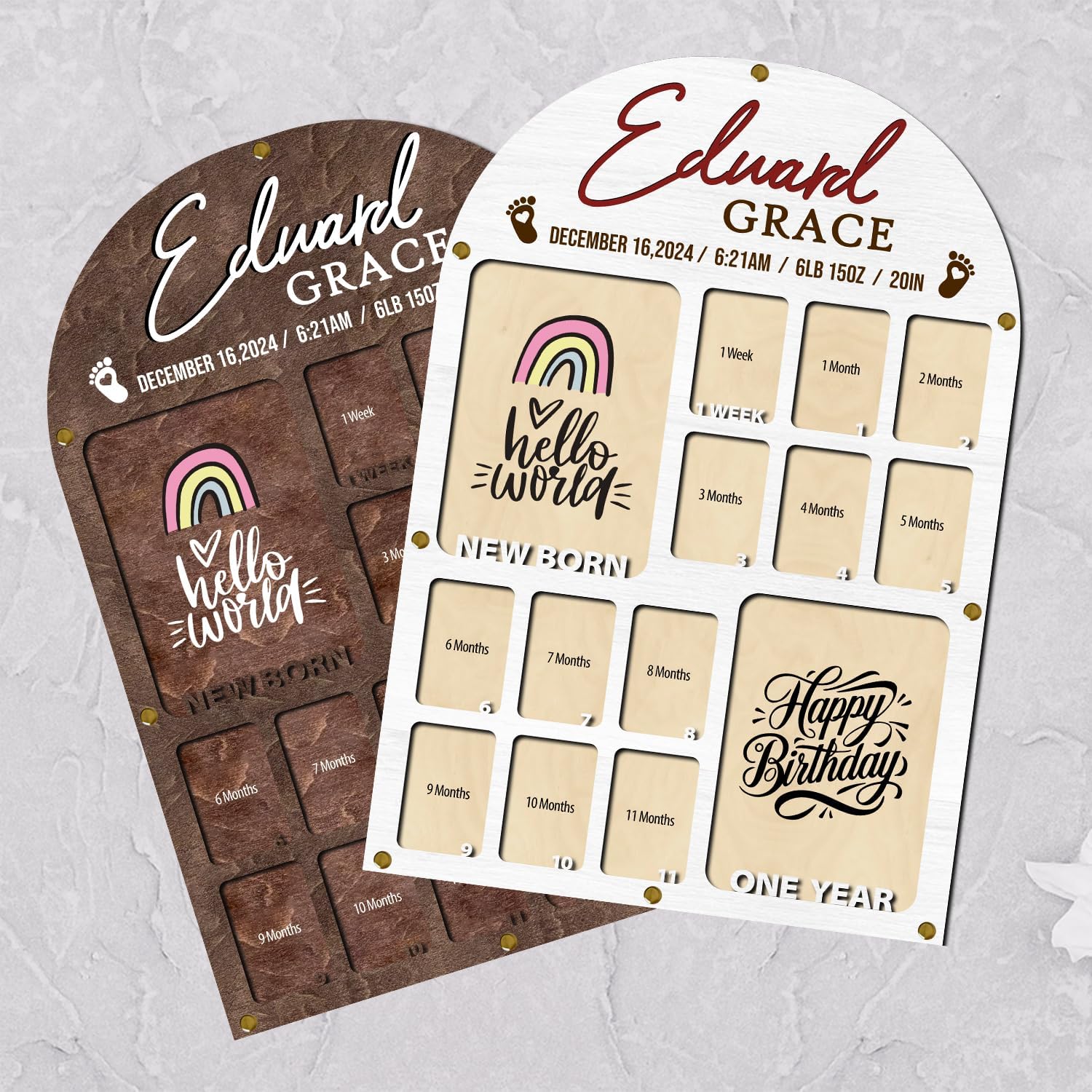 - My First Year Photo Frame: Capture your baby’s first year with our babys first year picture frame. This baby first year photo frame helps you record their growth from newborn to one year, showcasing each milestone in a 12 month picture frame for baby first year. The wooden plaque includes space for your baby’s full name, making it a personalized keepsake. Our 12 month pictures for baby first year, my first year photo board, one year photo board is a wonderful way to celebrate these moments.