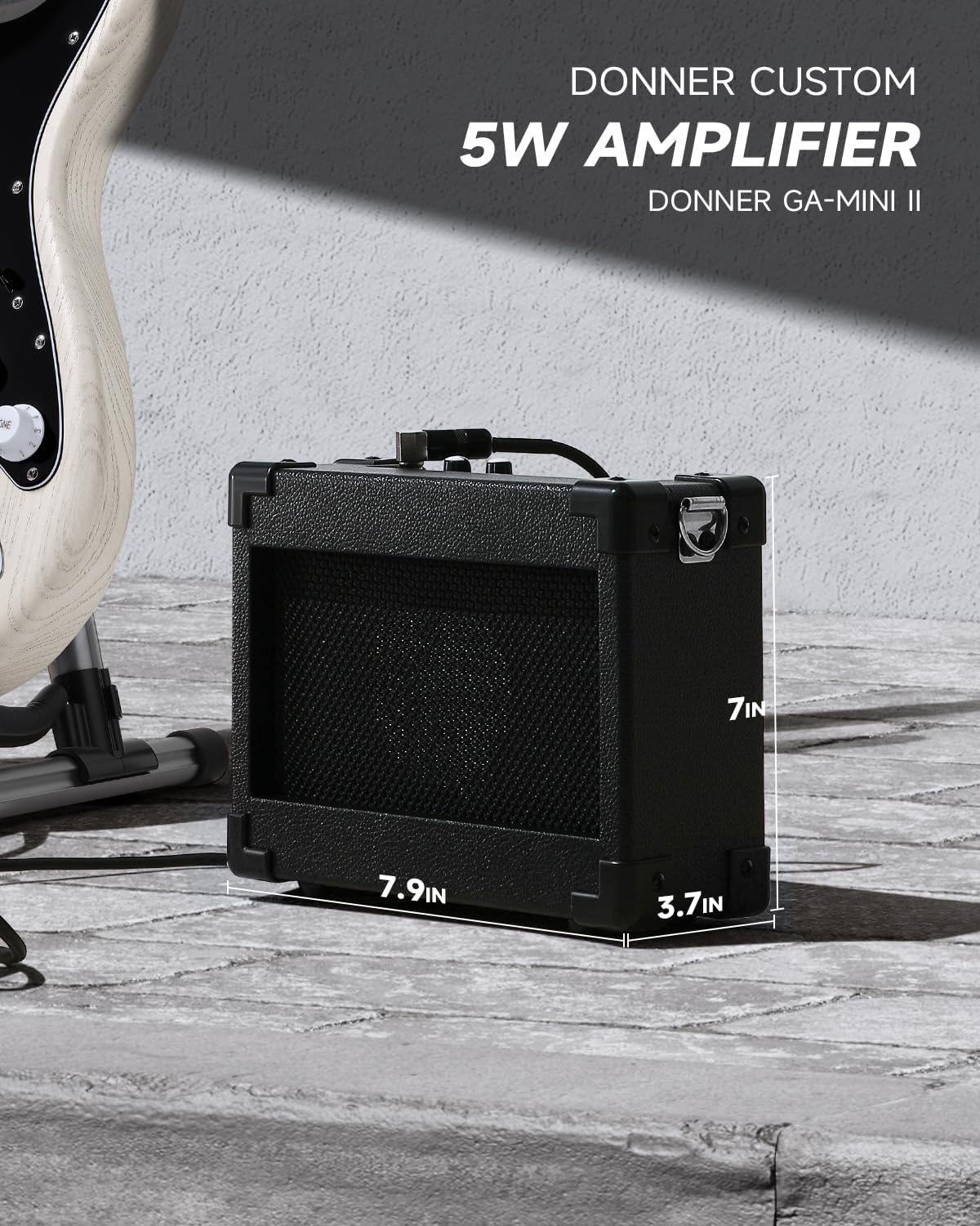 - COMPLETE BEGINNER’S PACKAGE:Open the box, and you’re ready to play. This beginner kits includes the DST-80 electric guitar, custom 5W amplifier, durable gig bag, capo, strap, extra strings, digital tuner, amp cable, picks, and access to free online lessons from Donner to help you grow and shine