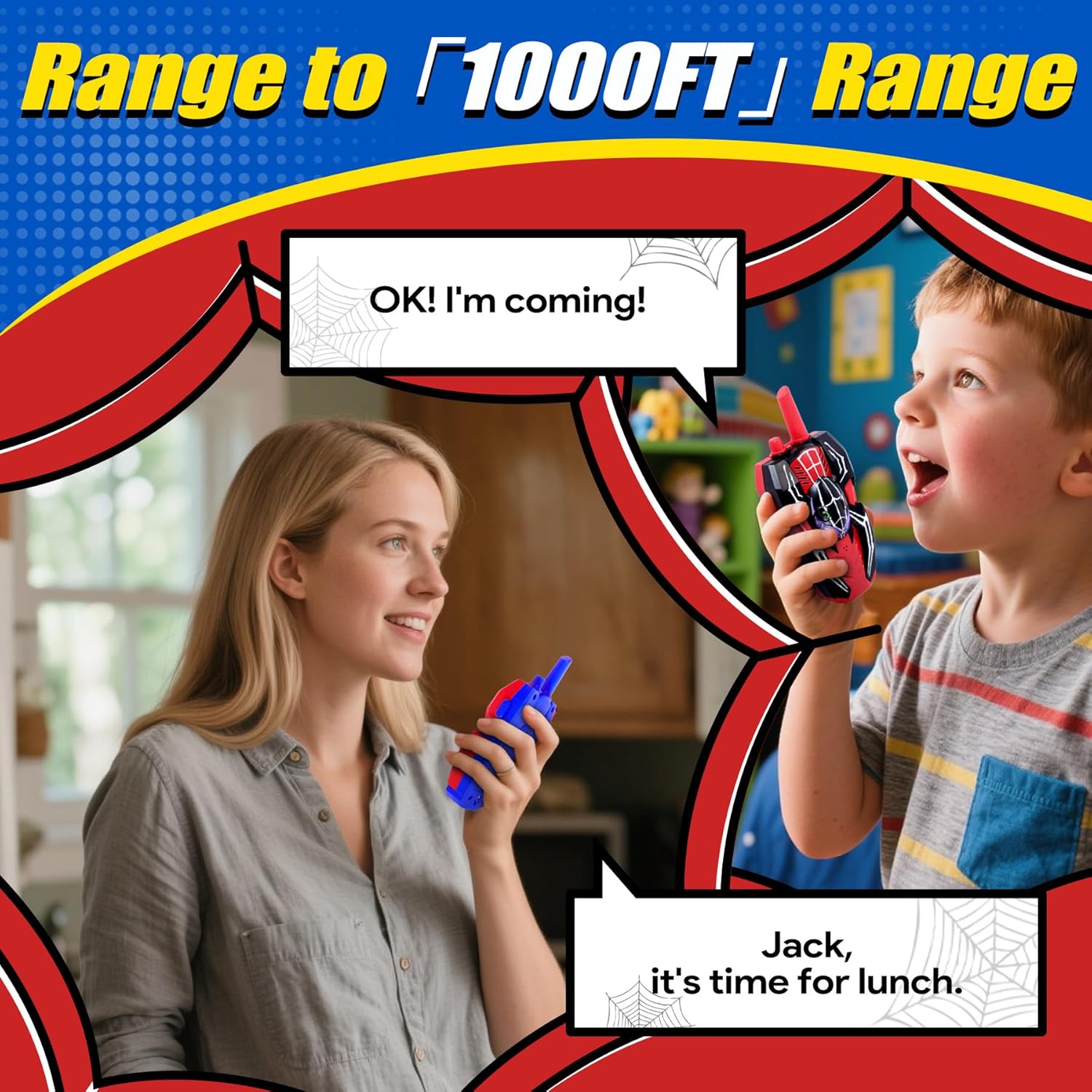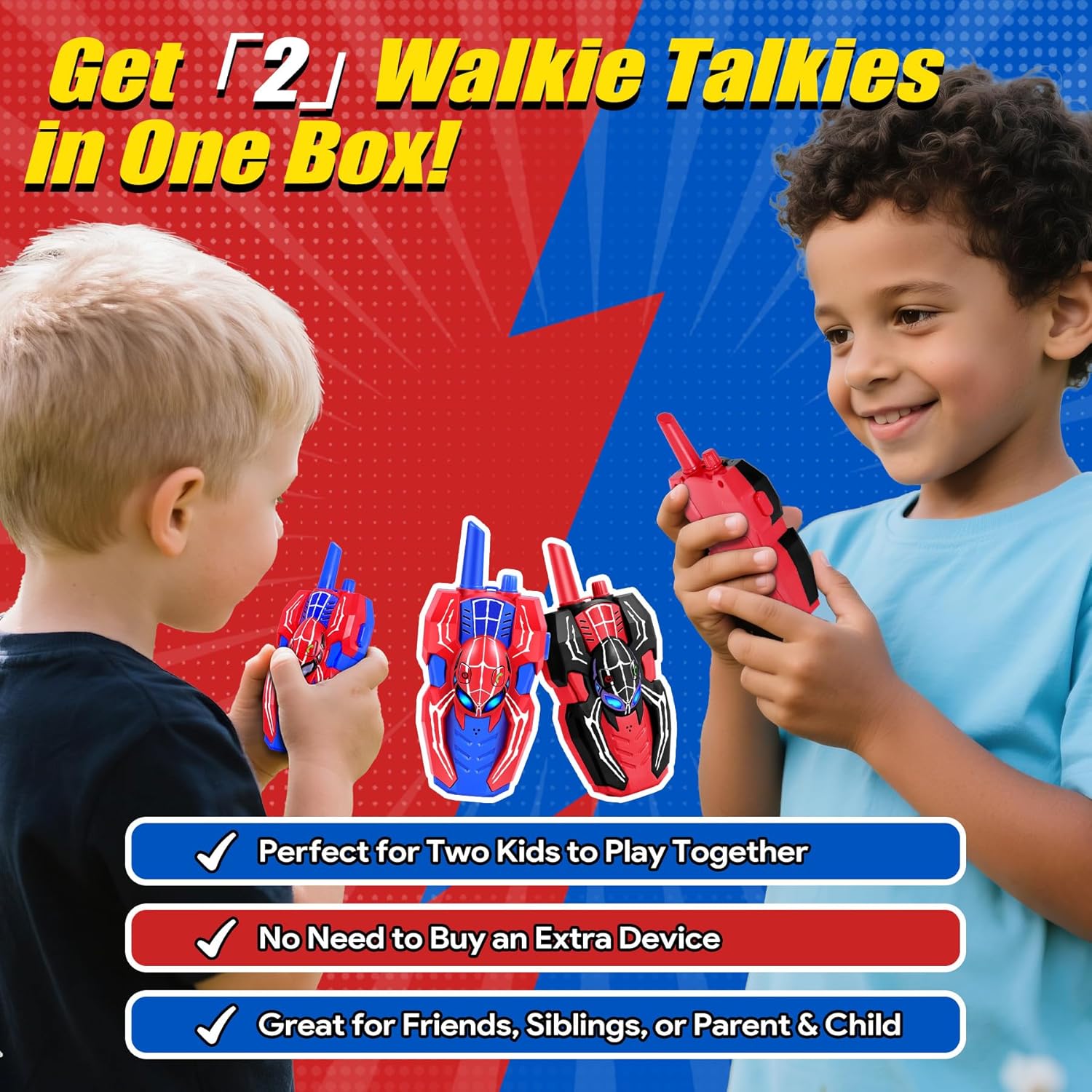 - Spider Walkie Talkies: Inspired by superhero role-play, these kids walkie talkies feature a fun spider theme loved by kids. Lightweight at just 100g, they are perfect outdoor toys for kids ages 3-12, whether exploring the backyard or on a camping trip