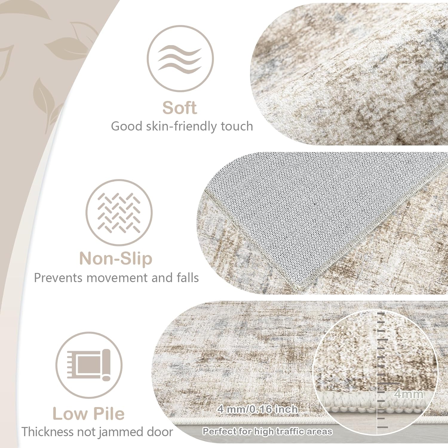 - Anti-Stain Low Pile Rug: Our washable rugs surface pile are short and dense, can block dust and hair embedded, spilled drinks coffee and other liquids will not penetrate into the neutral rug inside; Our 9'x12' large rug is moderately thick and won't snag on doors, which not only keeps indoor rugs clean, but also adds convenience for high traffic areas.
