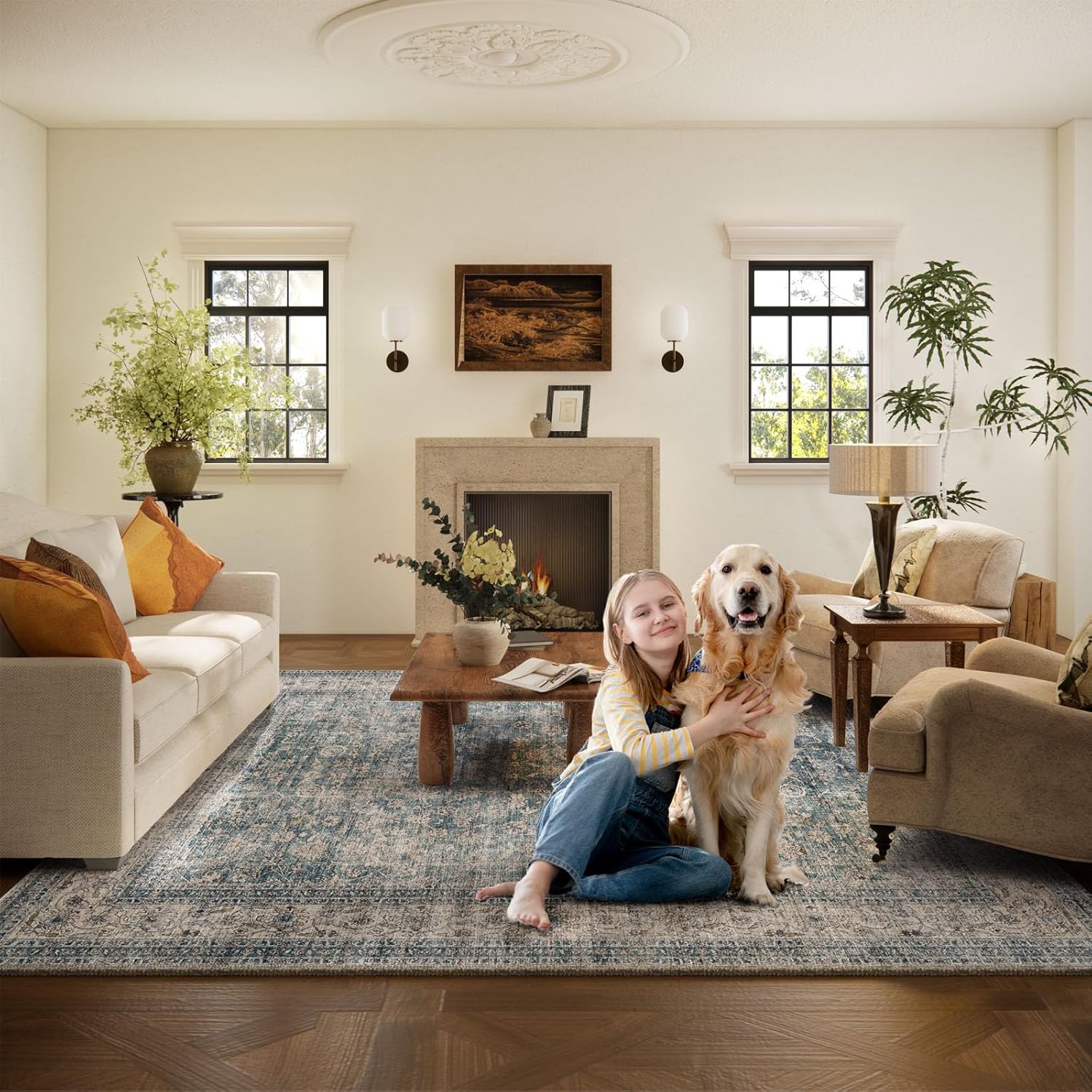 Machine Washable Living Room Rug: 6x9 Area Rugs for Bedroom Vintage Stain Resistant Non Slip Low Pile Lightweight Boho Carpet for Kitchen Dining Room Farmhouse Kids Room Nursery