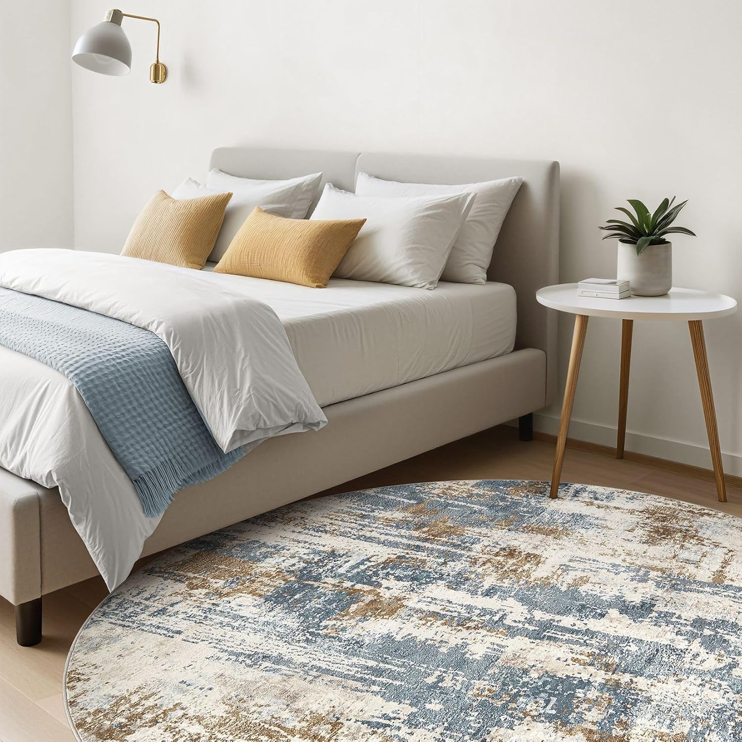 Round Rug Living Room Rugs: 10Ft Washable Circle Large Abstract Modern Soft Stain Resistant Non Slip Indoor Floor Carpet for Bedroom Nursery Office Dining Room Dorm Home House Decor- Tan Blue