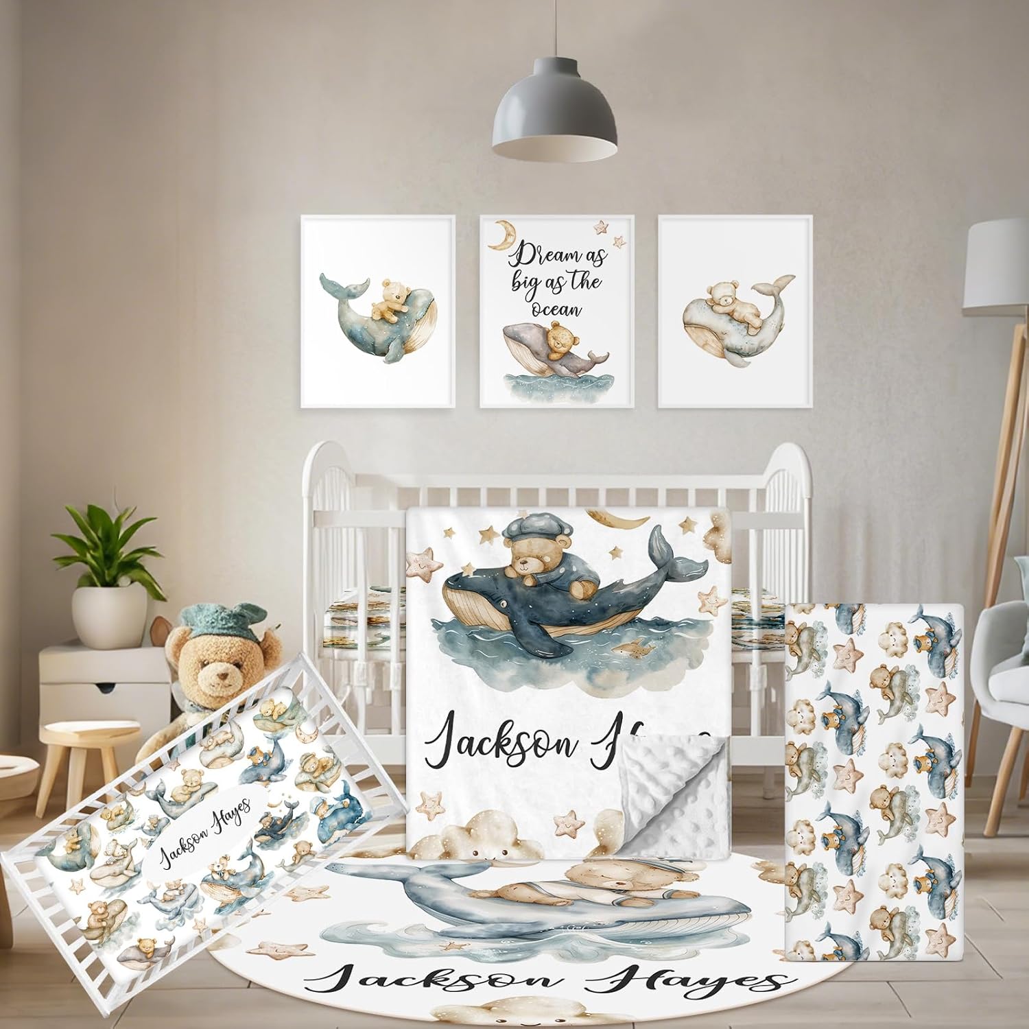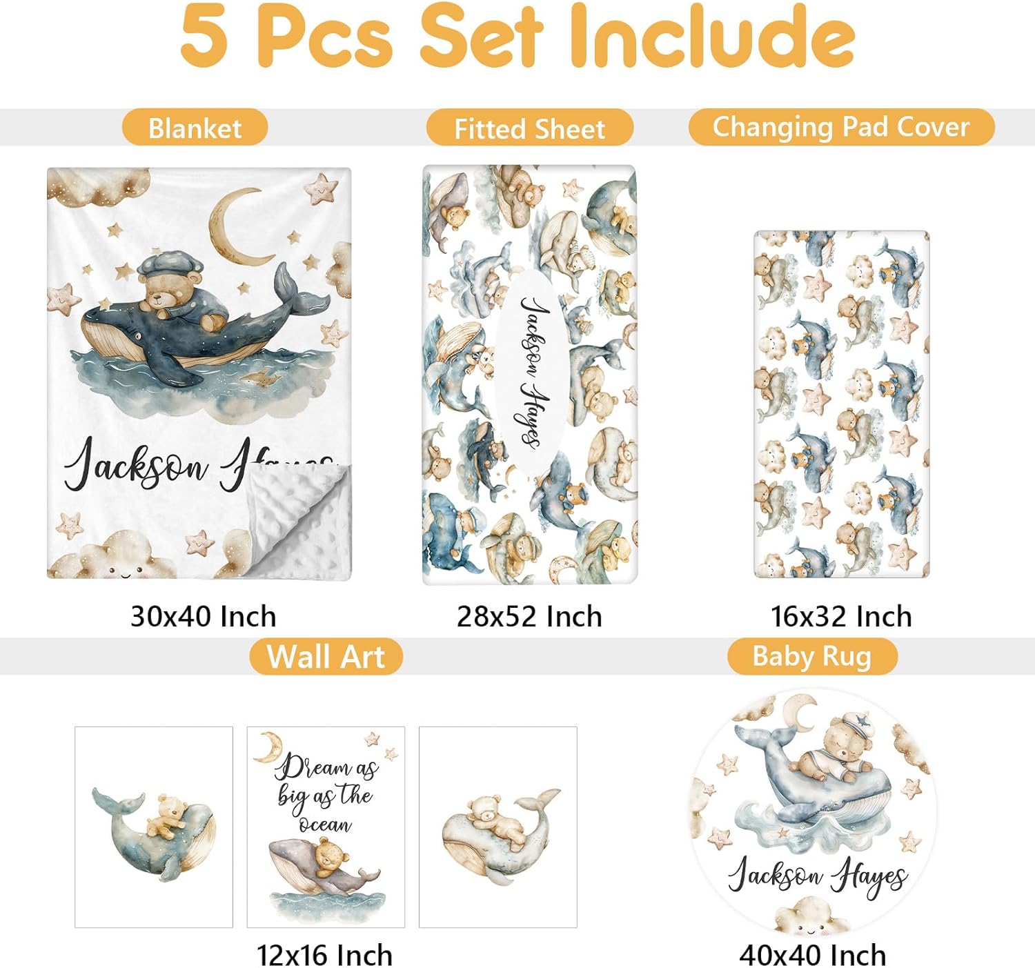 Personalized Baby Bedding Set - 5 Pcs Custom Infants Bedding Set with Infant Name - Double Layer Nursery Crib Set for Girls Boys - Customized Gifts for Toddler Baby Shower - Whales and Bears