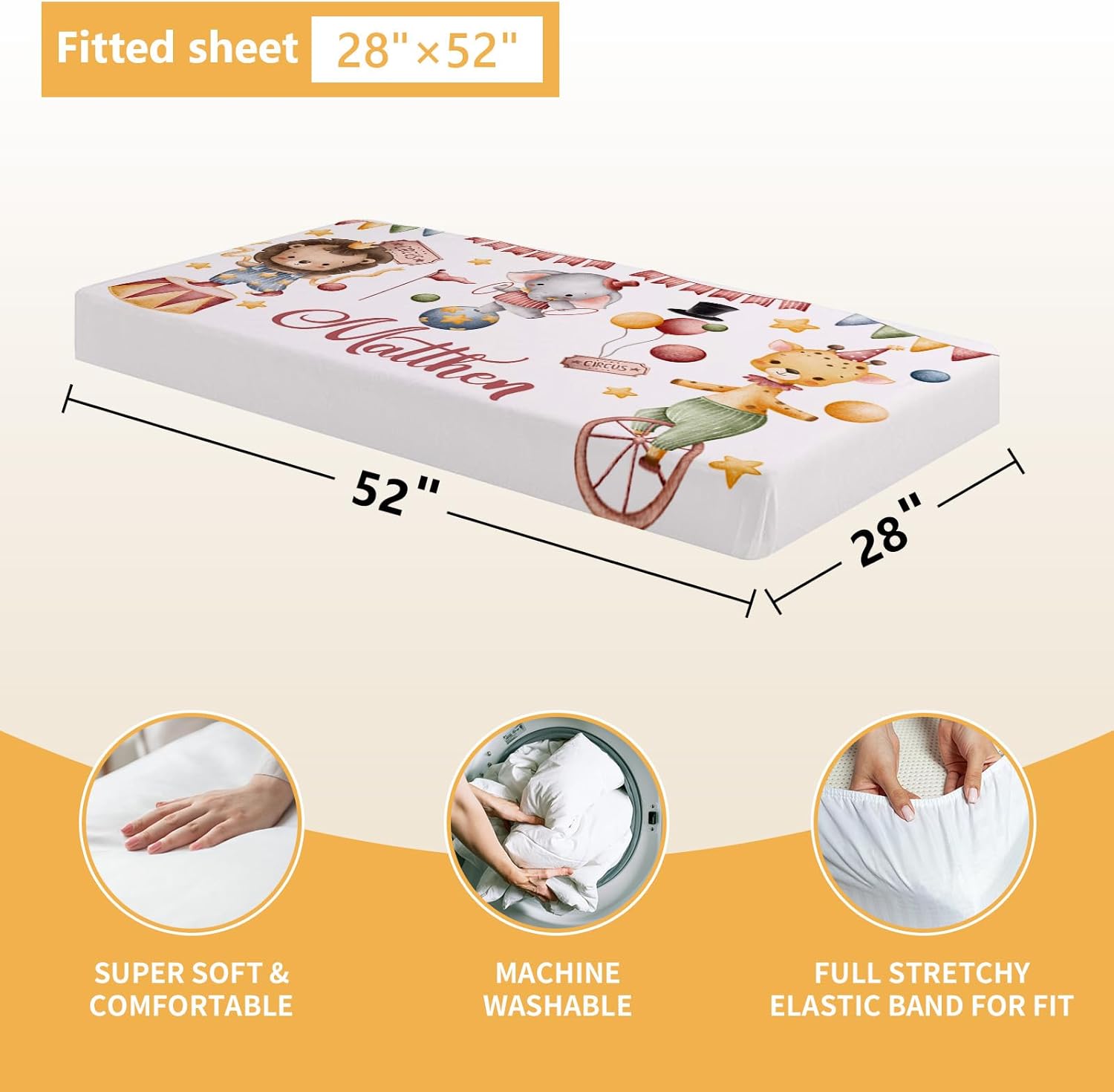 Custom Baby Crib Bedding Set, 5 Pcs Personalized Name Baby Crib Set with Double Layer Blanket, Soft Circus Animals Nursery Bedding Set for Girls Boys, Customized Gifts for Infants Toddlers