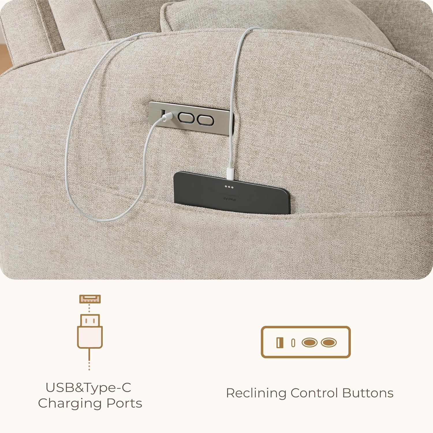 - Exquisite Convenient Design: This 270° swivel rocker recliner is designed with side pockets on the armrests, ideal for storing a laptop, bottles, or small items. USB and Type-C charging ports are built into the recliner's activation button, providing easy access to charge your devices and enhance daily life with added convenience.