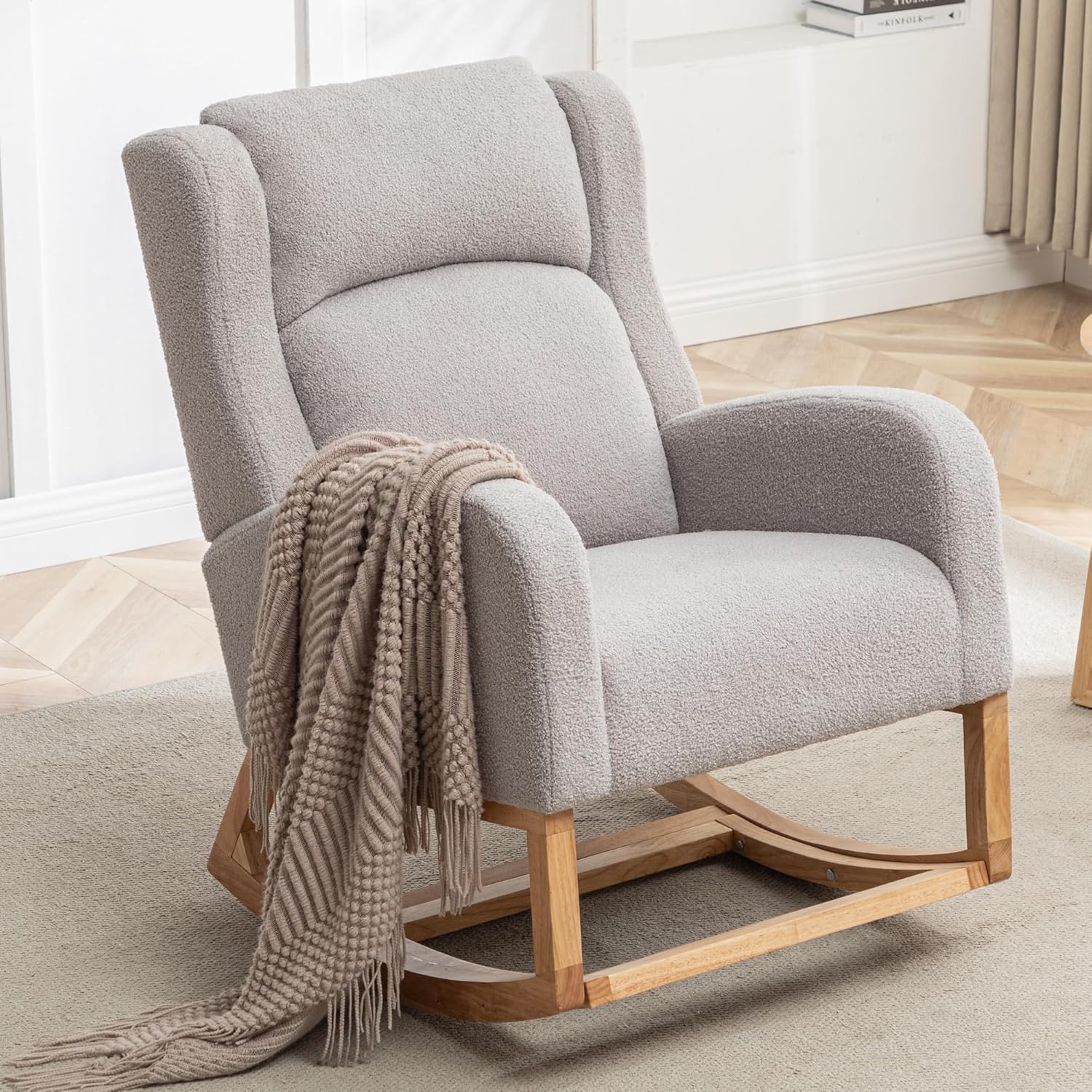 Rocking Chair Nursery, Nursing Rocking Chairs for Mom Nursery, Comfy Wingback Glider Rocking Armchair with Foot Rest and Side Pocket for Nursery Living Room Bedroom, Teddy Grey