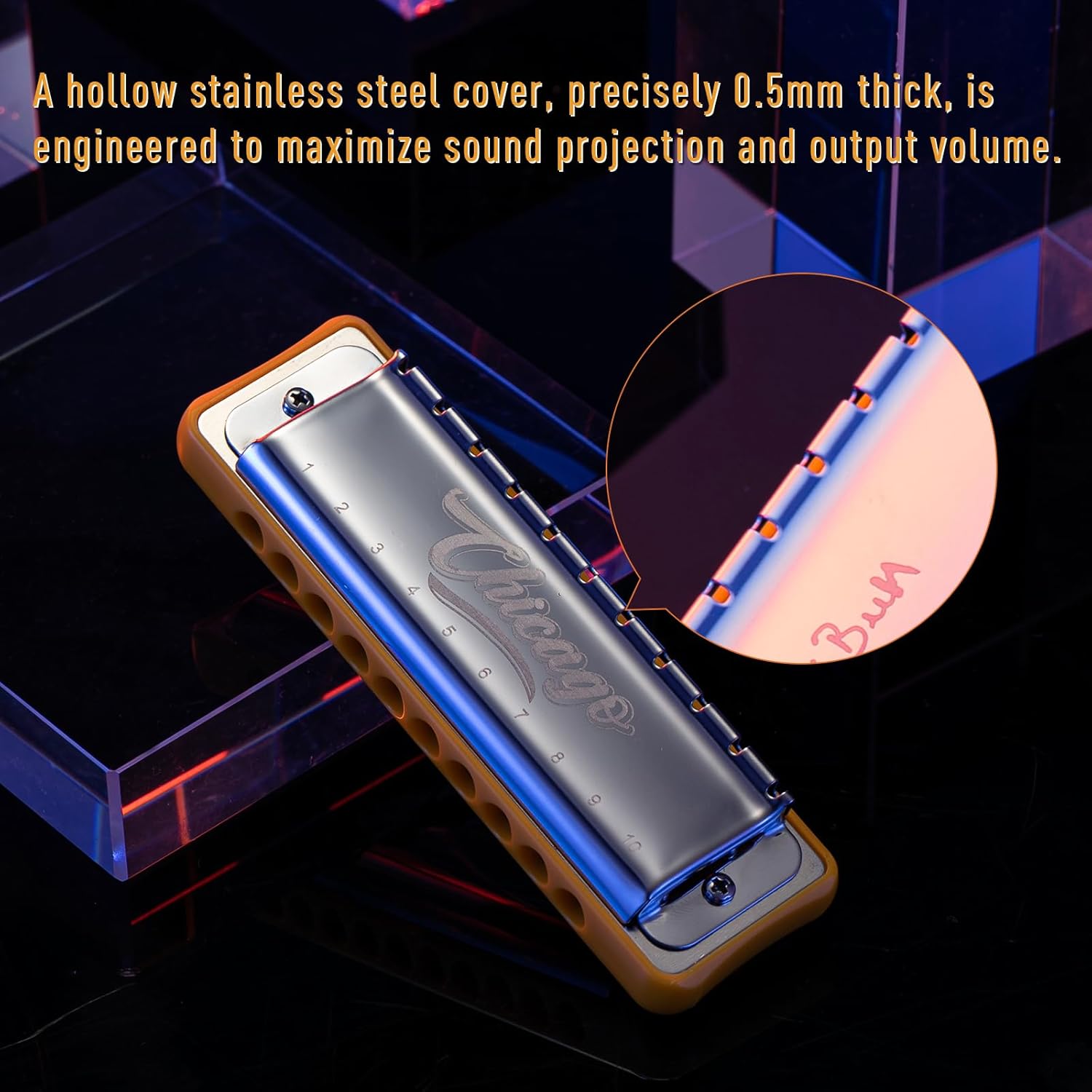 - Professional Design: Precision-crafted 10-hole harmonica in the key of Bb featuring 20 distinct tones, perfect for playing blues, folk, and jazz music with authentic Chicago-style sound
