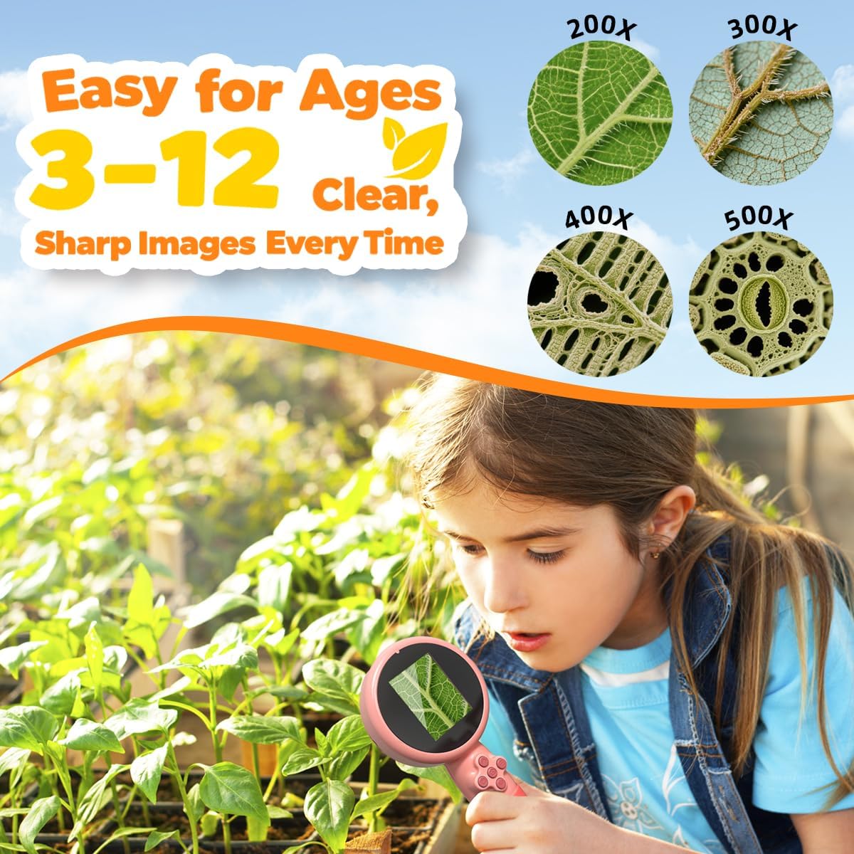 - 200Xβ500X Magnification with 1080P HD Clarity: High-resolution lens makes the microscopic world come alive. Kids can observe insects, plants, and everyday objects clearly, without blur or distortion, boosting their curiosity and learning.