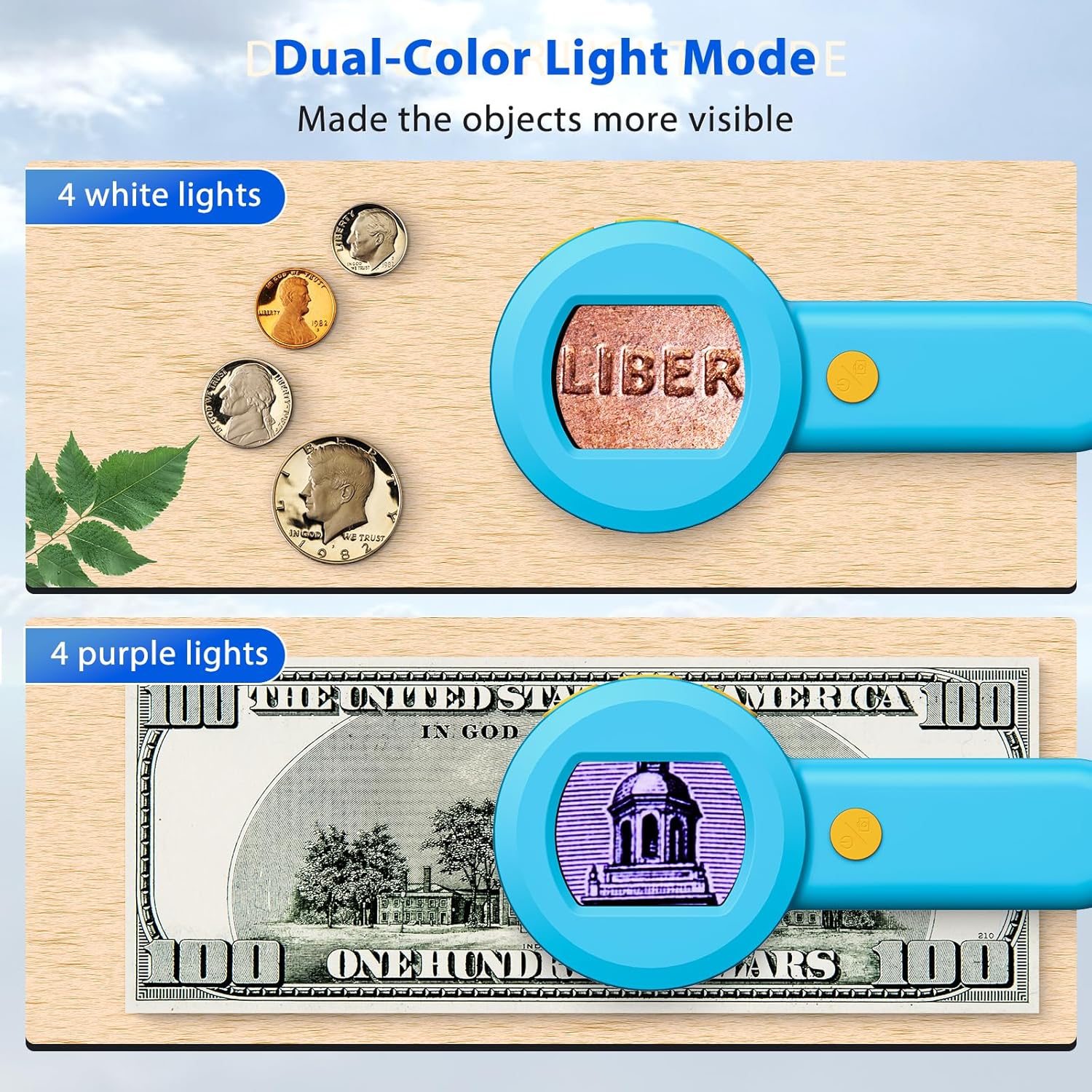 - Dual Light Source for Clear Imaging: Featuring 4 white LED lights and 4 UV lights, this jewelers loupe ensures bright, clear images. Ideal for examining stamps, banknotes, and intricate items, you can easily switch between white and UV light for enhanced detail.