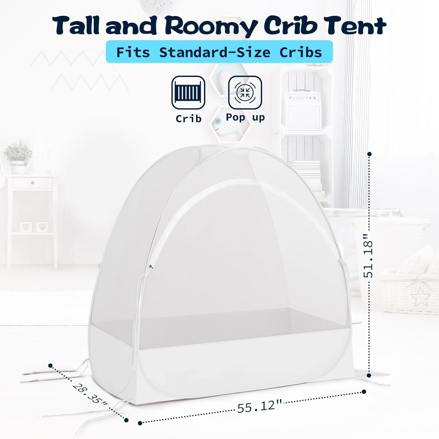 - Easy To Install: Just need to open the package, remove the fixed rope, the baby crib tent will automatically pop-up, fixed on the bed with the rope to the mini crib tent. The large opening of the crib tents for toddlers allows you to easily put the mattress and baby into the crib, so that you can finish the installation and use it in a few minutes.