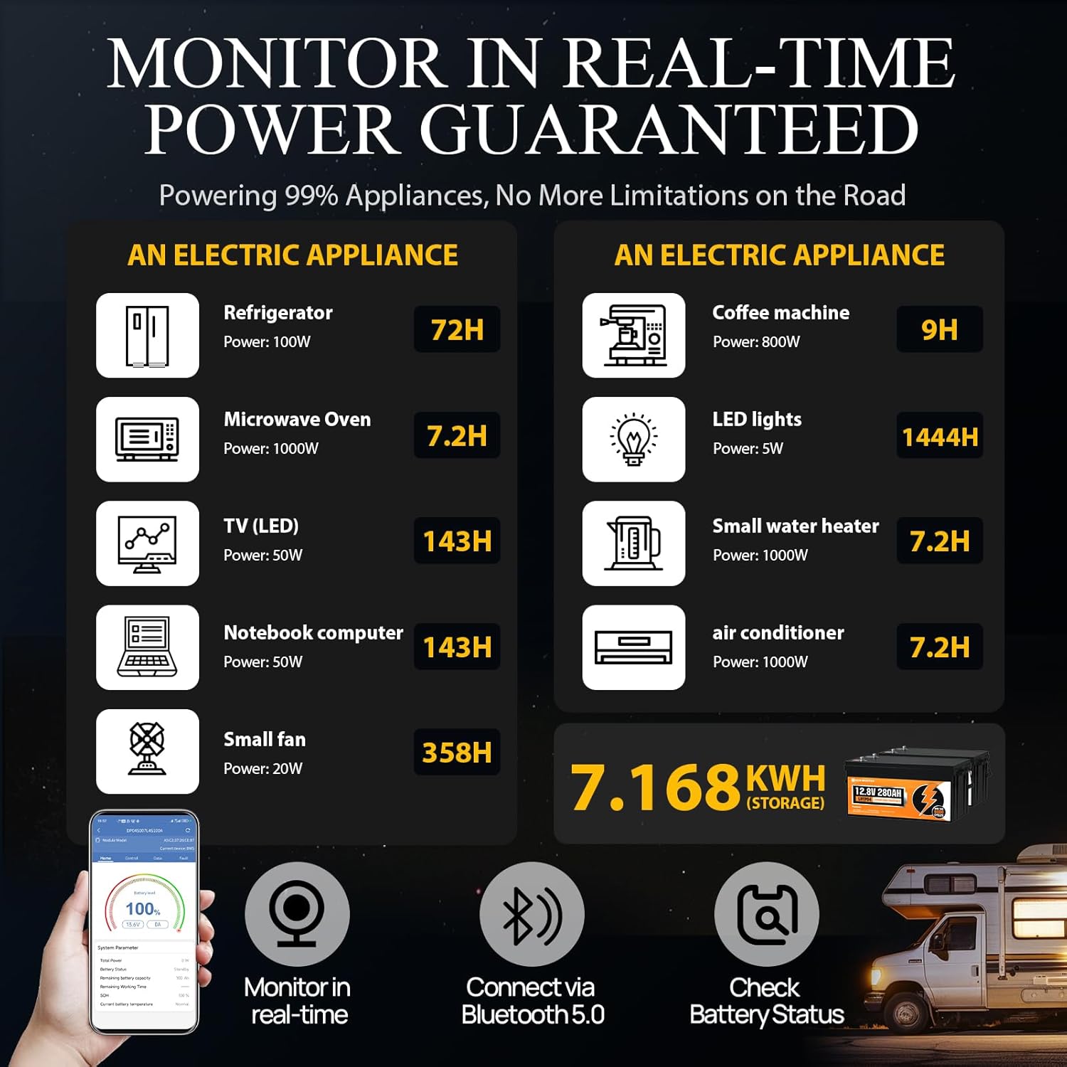 - 【Worry-free Power】Equipped with 4PCS 200W bifacial solar panels equipped with 25.2% High-Efficiency Solar Cell, 4 hours of sunlight per day can generate 3.2 kWh of electricity, and the battery can store up to 7.168 kWh of electricity. The system can power 99% of RV appliances, including refrigerators, air conditioners, microwave ovens, TVs, fans, coffee machines, LED lights, and water heaters. It is perfect for off-grid adventures, providing reliable and sustainable energy for your RV needs