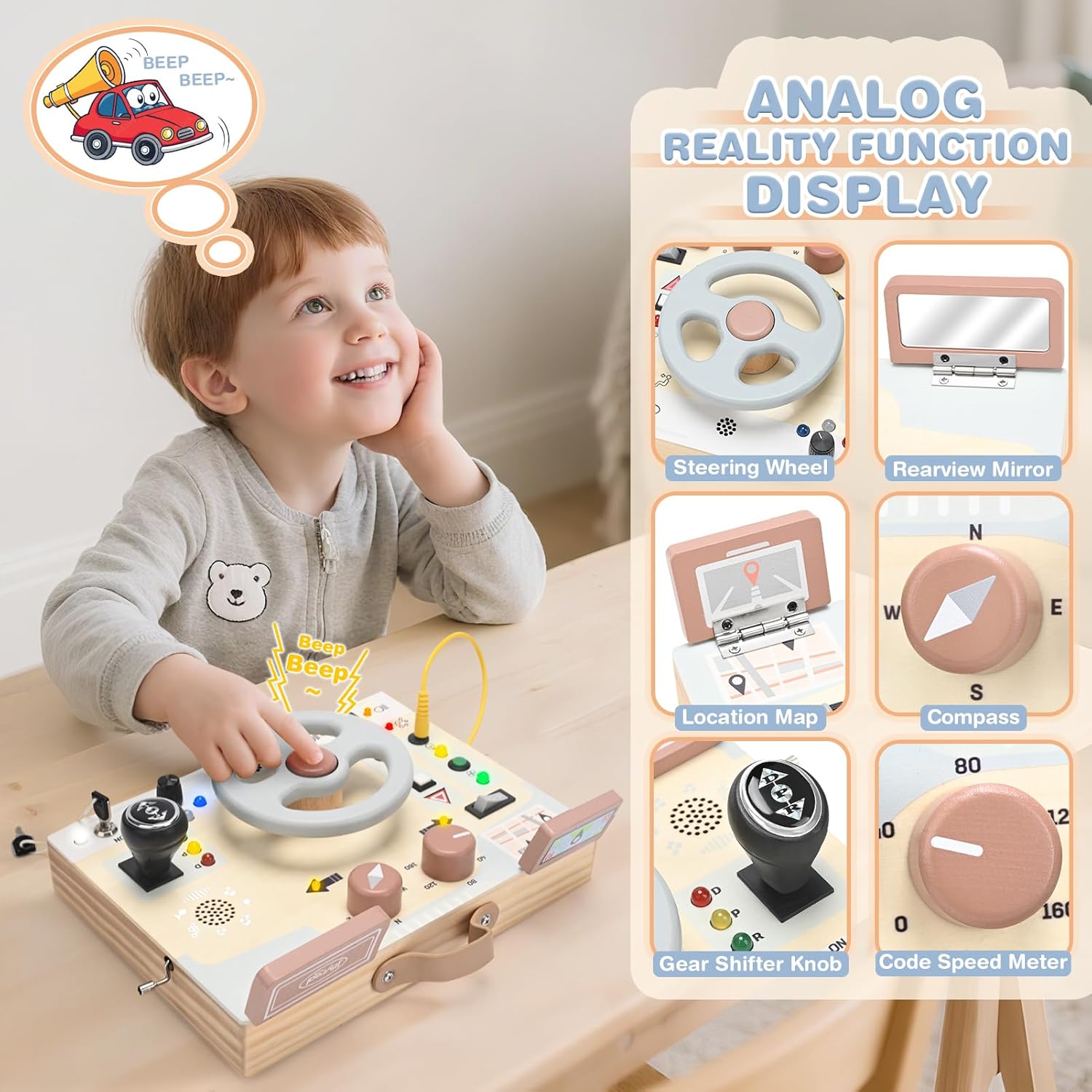 - 【Car-Themed Interactive Fun & Creativity Stimulation】This busy board is themed around car driving, combining 9 switches, 15 LED lights, a music player, and simulated driving functions. The montessori busy board features a rotating steering wheel that makes sounds and an operable gearshift lever. The busy boards can develops children's imagination, sensory perception, and hand-eye coordination, allowing them to explore the world of transportation through fun and interactive play. Requires 3*AA batteries (not included).