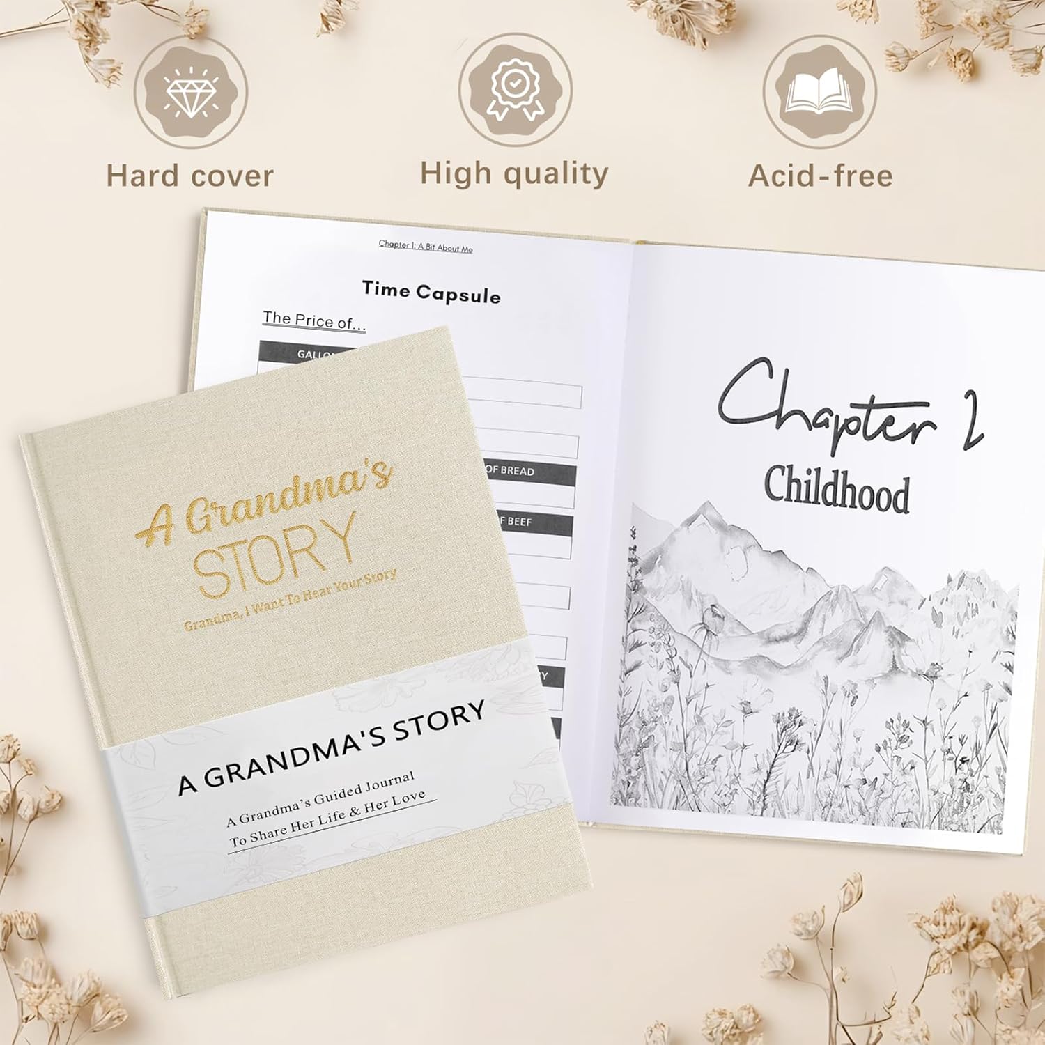 - Include 1 guided journal book with prompts questions, it's a perfect gift idea for grandma. There are more than 250 fun questions to fill out, and these questions are carefully designed to help grandma share her memories and tell her life story in her own way.